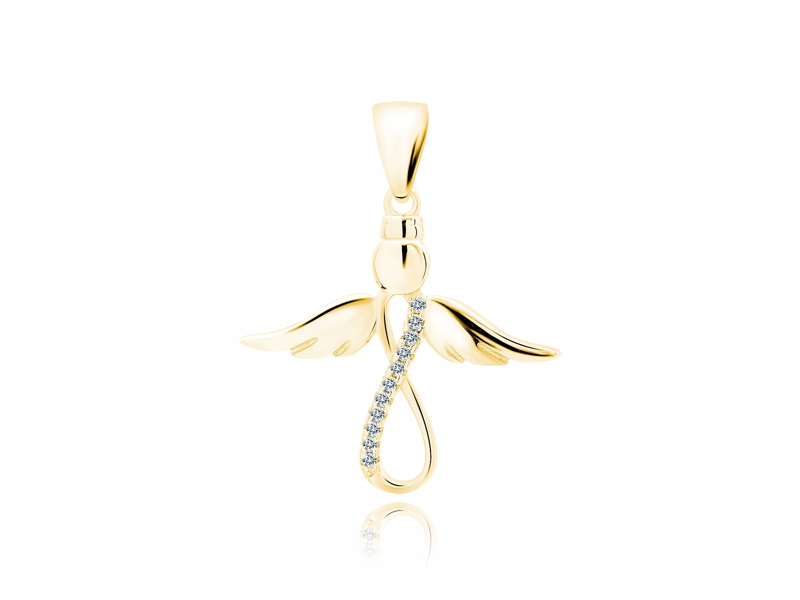 Элегантный кулон из позолоченного серебра в форме символа бесконечности, украшенный крыльями и головой, имитирующей ангела, украшенной белыми цирконами.