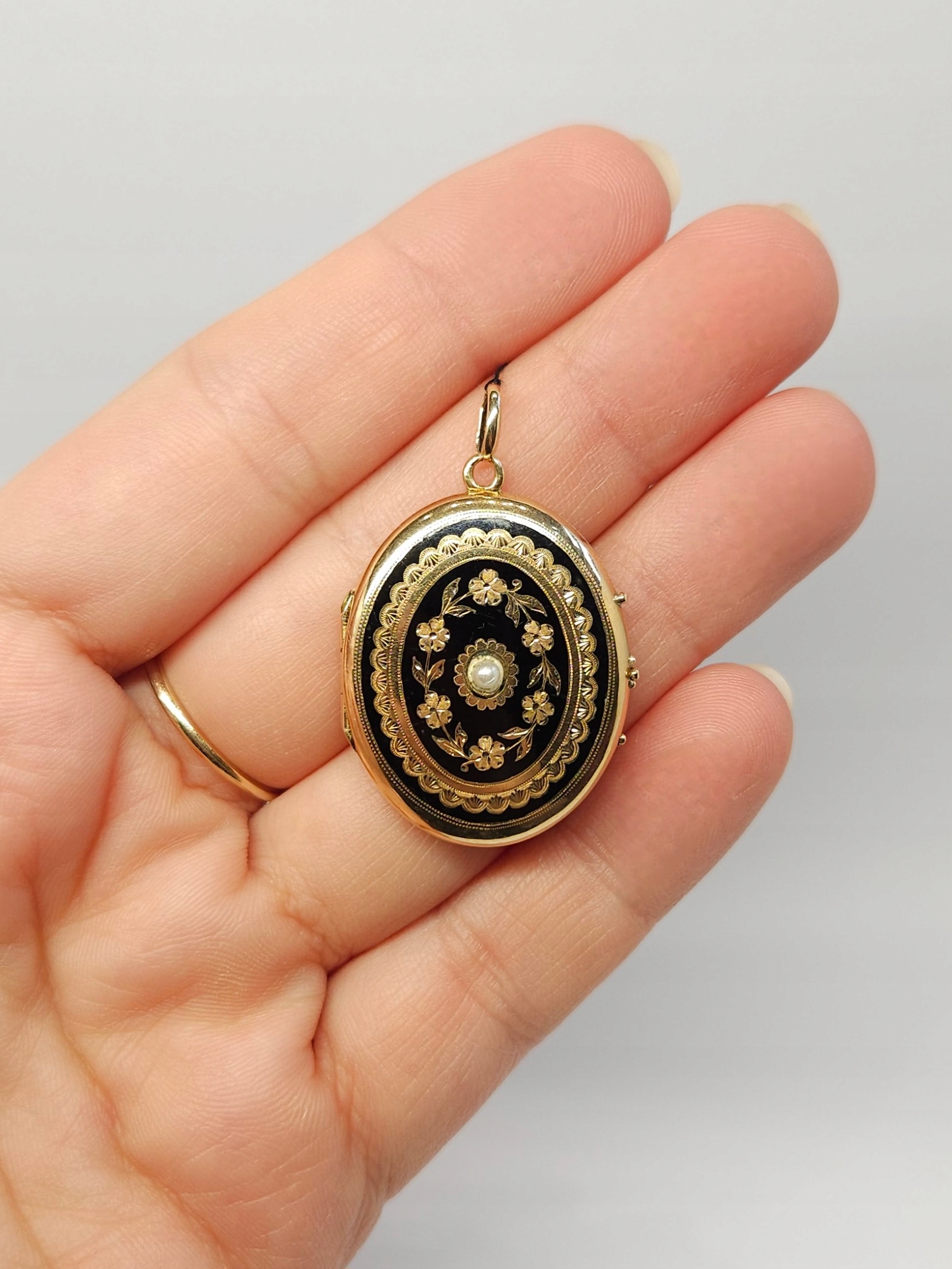 Золотой, овальный секретер - кулон с местом для двух фотографий, с отделкой. XIX век, украшен с обеих сторон черной эмалью и маленькой белой полужемчужиной; В силу возраста имеются незначительные дефекты эмали, заметные на фотографиях