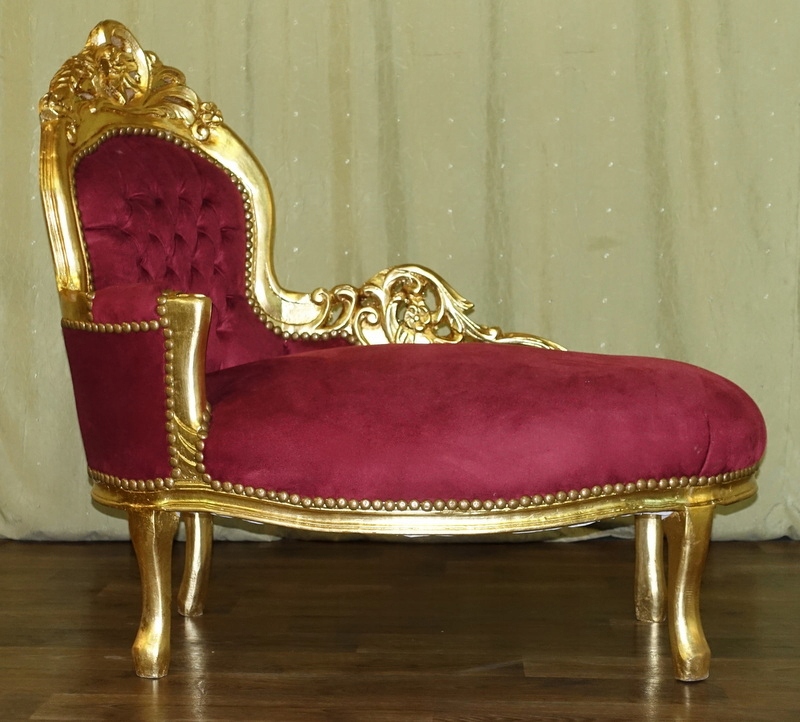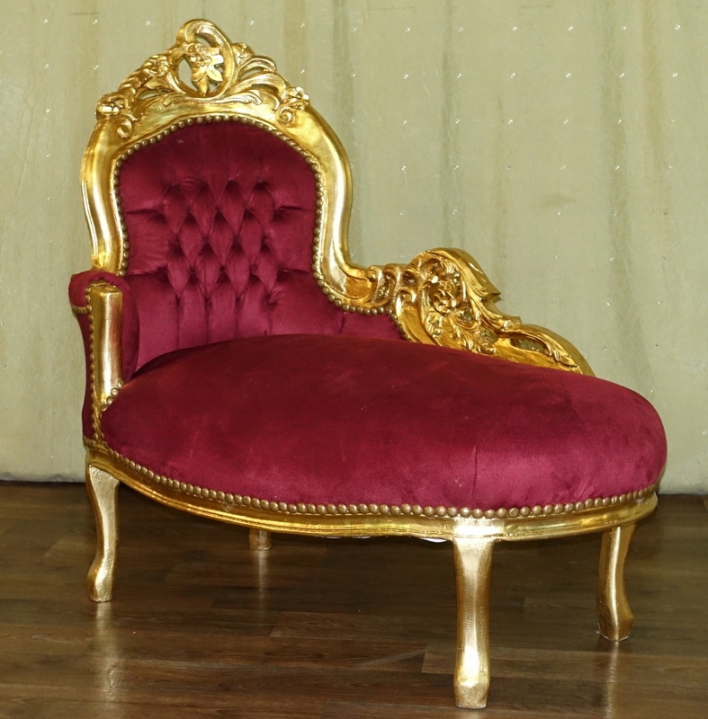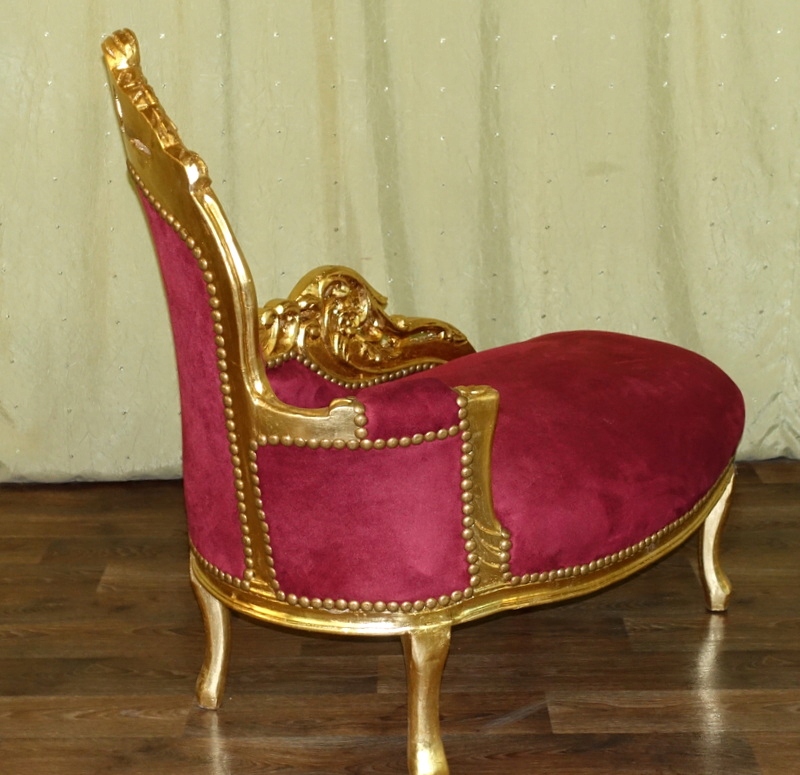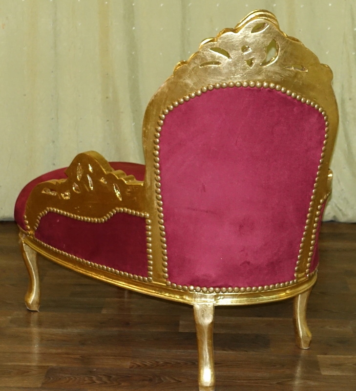 Современная копия дивана – шезлонг. Товар новый, не использовался. Обивка выполнена из плюшевого материала бордового оттенка. Деревянная конструкция цвета старинного золота с изысканной резьбой. Очень рекомендую как практичный предмет мебели и украшение гостиной