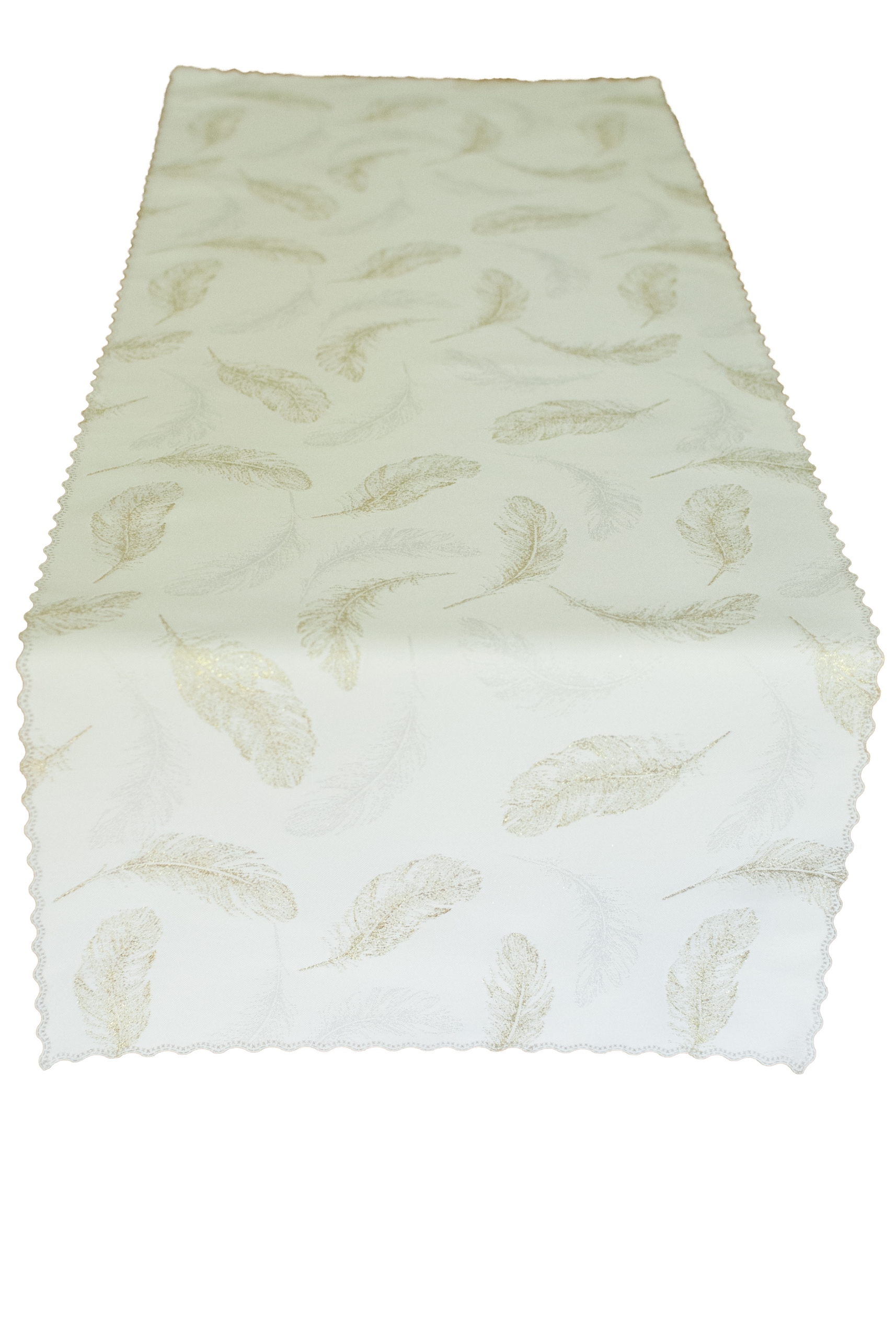 Роскошная настольная дорожка насыщенного золотого цвета с одной стороны и кремового цвета с другой, с блестящими золотисто-белыми перьями. Перья добавляют легкости, а металлизированный узор является блестящим украшением.