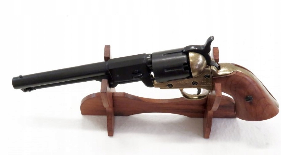 Отличная копия револьвера из шести курортов, представленная в 1851 году для военно -морского флота США - флота Соединенных Штатов. Револьвер изготовлен из алюминия цинкового сплава Zn - Al. Представлено в впечатляющей комбинации 2 цветов: золотая патина с черной. Обработка обивки, сделанная из окрашенного дерева.