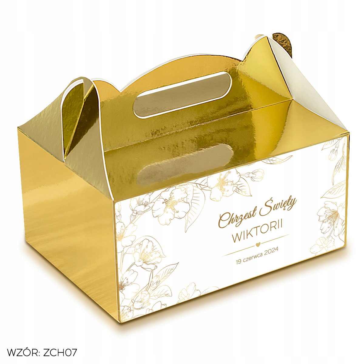 Коробка упаковка золото для торта с персонализированным ярлыком крещения.