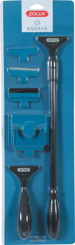 Набор для чистки аквариумных стекол состоит из телескопического скребка длиной 50-70 см, небольшого скребка для рук и трех различных насадок: губки, металла и пластика.