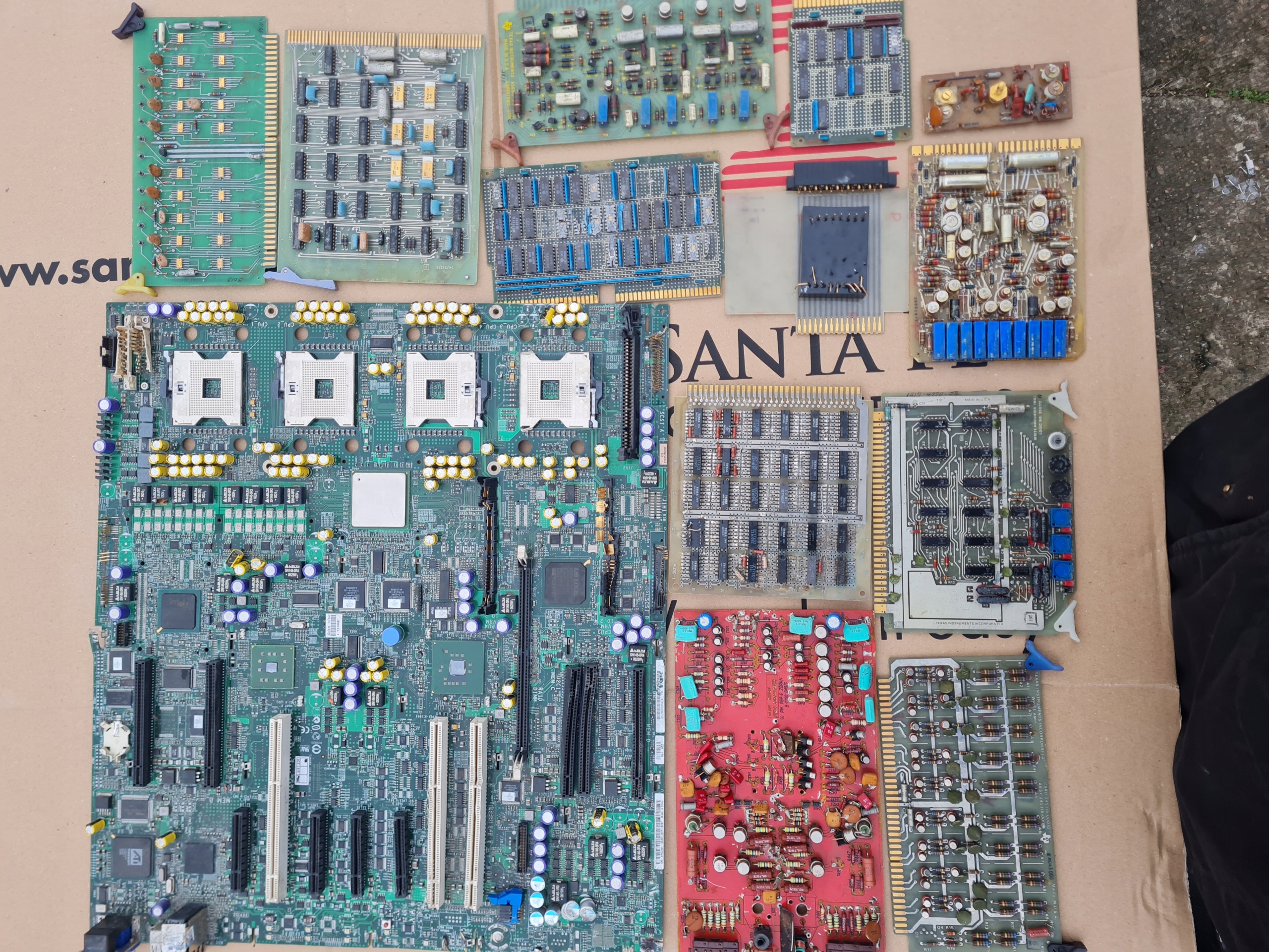 Достаточно богатый набор старой электроники в виде измерительных плат и большой серверной платы с 4 гнездами.