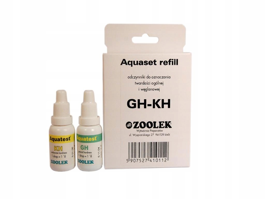 Акватест GH-KH предназначен для определения общей жесткости (GH) и карбонатной жесткости (KH) воды с точностью до 1 немецкого градуса (°n). Метод определения в обоих тестах предполагает добавление реагента по каплям (с точным подсчетом капель) к измеряемой пробе воды. Об окончании реакции свидетельствует изменение цвета, указанное в прилагаемом образце. Объем реагентов GH и KH позволяет определять примерно 2x300 °n.