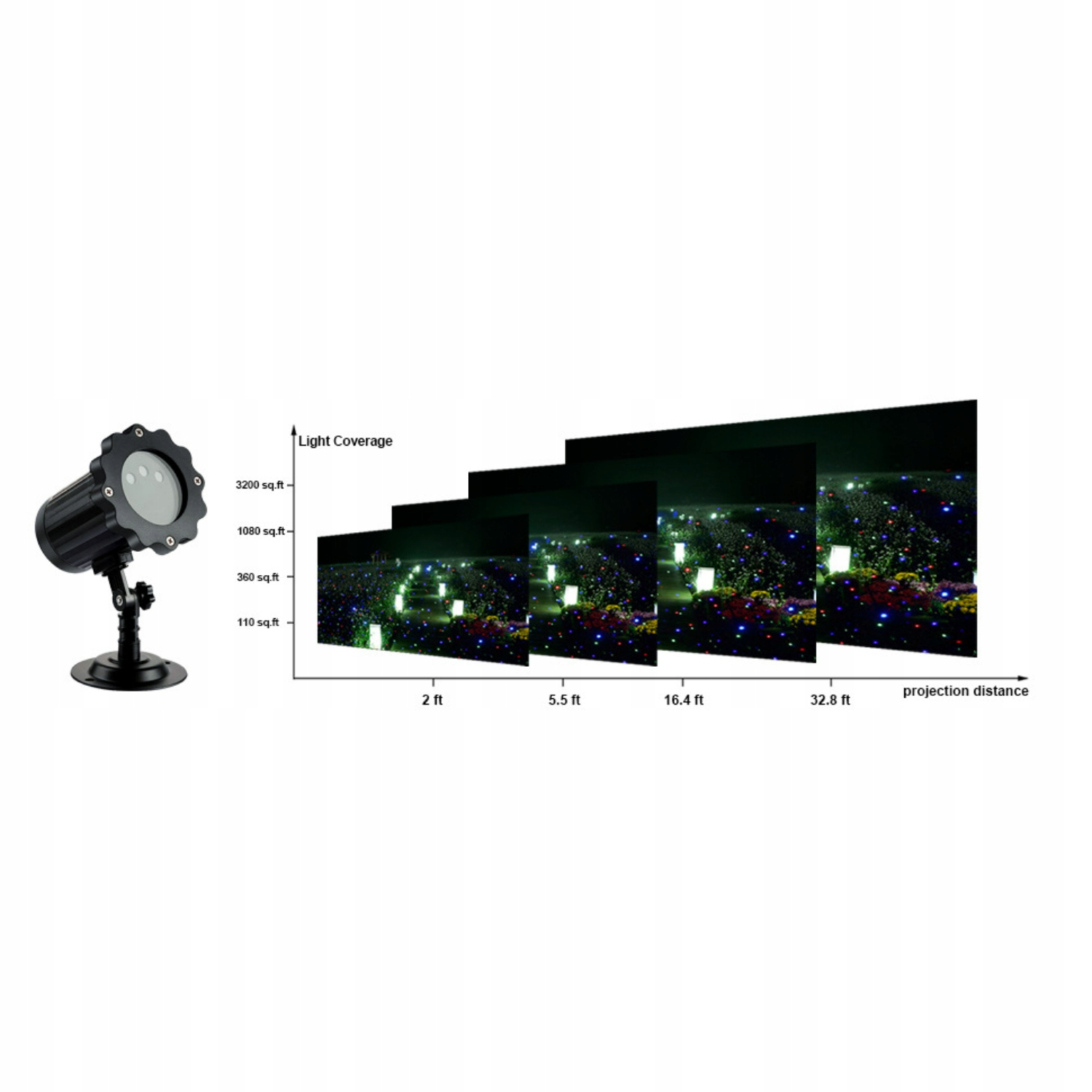 Шнур питания удлиняется до 16,4 футов. Вам не нужно беспокоиться о прикосновении к внешнему источнику питания. Свет может освещать площадь до 3200 квадратных футов с расстояния 32,8 фута.