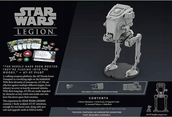 В расширении At-Star War: Legion вы найдете единую, идеально скульптурную, массивную миниатюру AT-ST, которую можно сложить так, чтобы она была выделена на поле битвы и стала конгрессовой точкой для всей вашей армии. В дополнение к миниатюре вы найдете ассортимент всех карт единиц и карт улучшения, которые вам понадобится для полной интеграции AT-ST с военной машиной империи и ваших армий.
