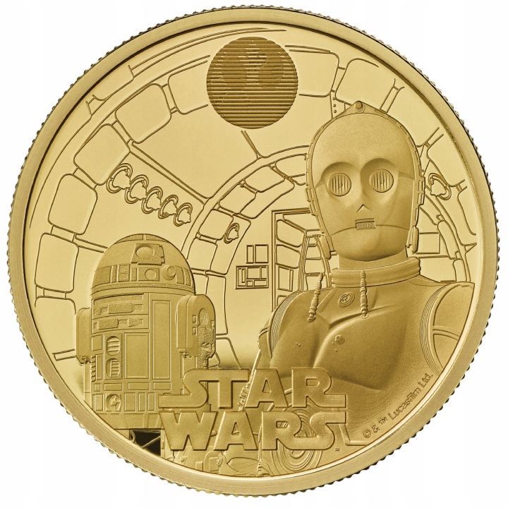 <р> Монета отчеканена из чистого слитка Au.9999, весом одна тройская унция и диаметром 32,69 мм, в стандарте пруф. Более того, это необычное изделие было произведено Королевским монетным двором. Товар был помещен в оригинальную упаковку. Монета имеет гарантию правительства Великобритании в отношении ее законности, чистоты и происхождения металла, а также является законным платежным средством в стране эмитента. <р> На аверсе изображен образ короля Великобритании Карла III, а также номинал и год, разработанные Мартином Дженнингсом.На реверсе монеты изображены два дроида: R2-D2 и C-3PO, а также надпись «STAR WARS» и информация об авторских правах, принадлежащих Lucas Film Ltd.