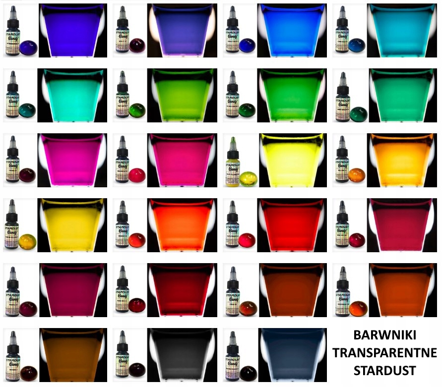 ВНИМАНИЕ: красители очень концентрированные! Цвета фотографий могут отличаться от конечного эффекта из-за типа используемой смолы. Образцы цвета для презентации красителя были изготовлены из смол и .