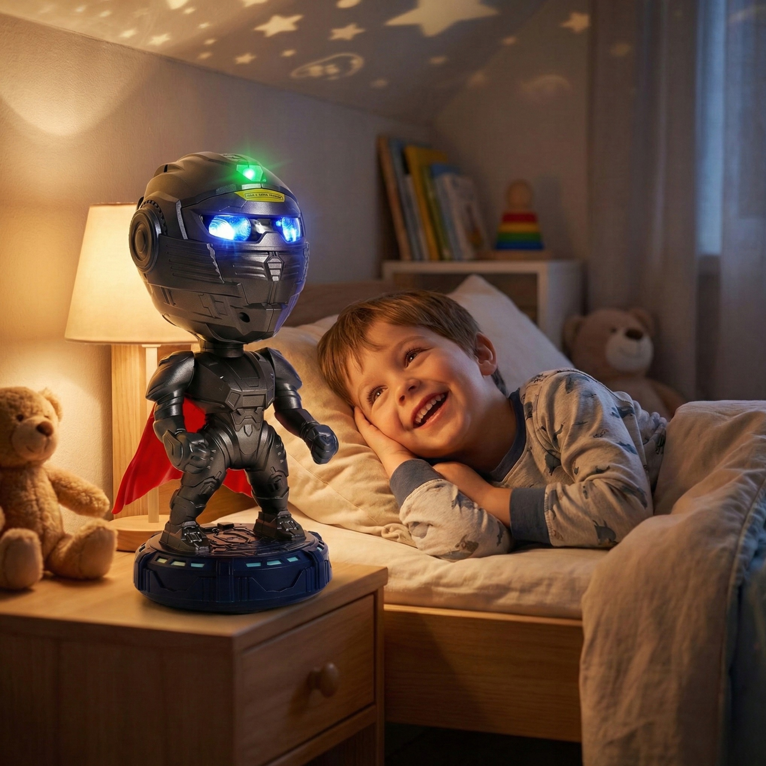 Проектор выделяется своим дизайном, вдохновленным космическим воином, что делает его отличным дополнением к детской комнате. Благодаря подвижной голове, ручкам и съемной накидке это не только красивое украшение, но и интерактивная игрушка.