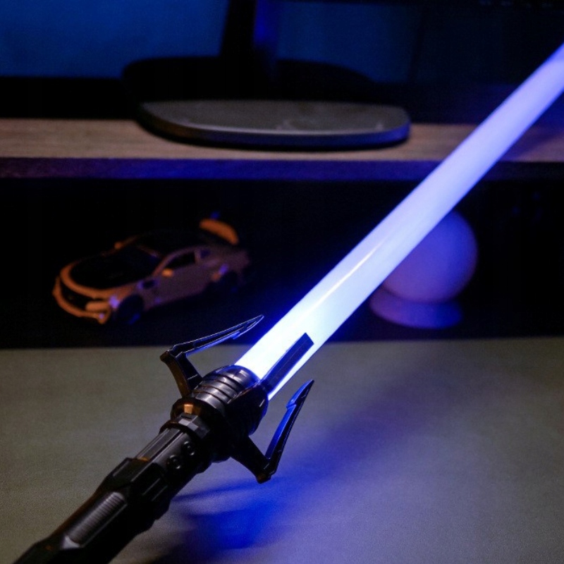 - При нажатии кнопки на ручке меч начинает светиться. Это сопровождается реалистичными боевыми звуками, которые позволяют ощутить эмоции и динамику космических сражений.