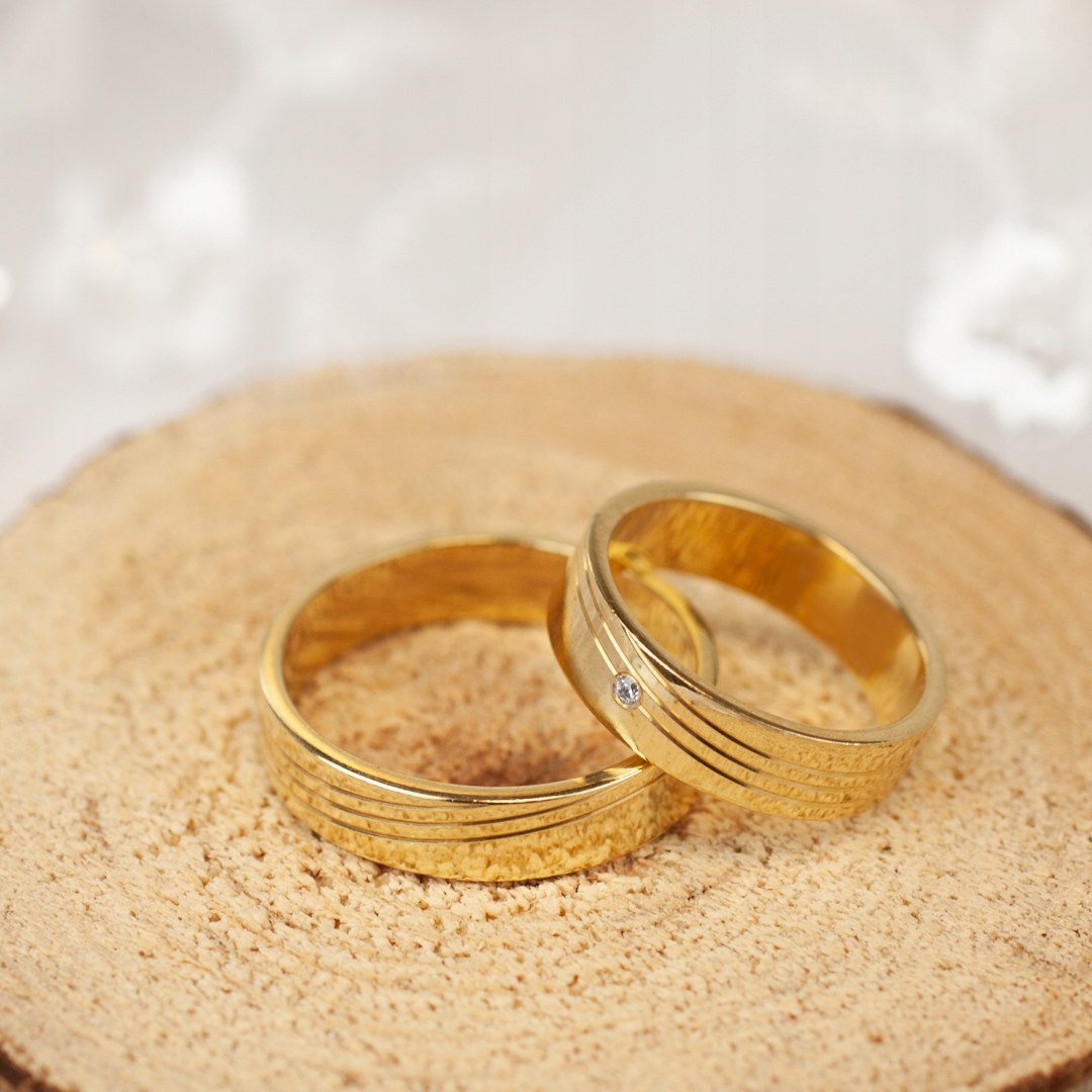 Нежно декорированные золотые обручальные кольца с плоским профилем. Они имеют гладкую, полированную поверхность и дополнительно украшены тремя надрезами, выполненными алмазным ножом. Рисунок интенсивно блестит и прекрасно отражает свет. Отличительной особенностью женского обручального кольца является вделанный в него камень. Мы изготавливаем обручальные кольца с особой тщательностью, желая, чтобы вы могли наслаждаться ими как можно дольше. Их покупка – это гарантия высокого качества, которое сочетается с очень привлекательной ценой.