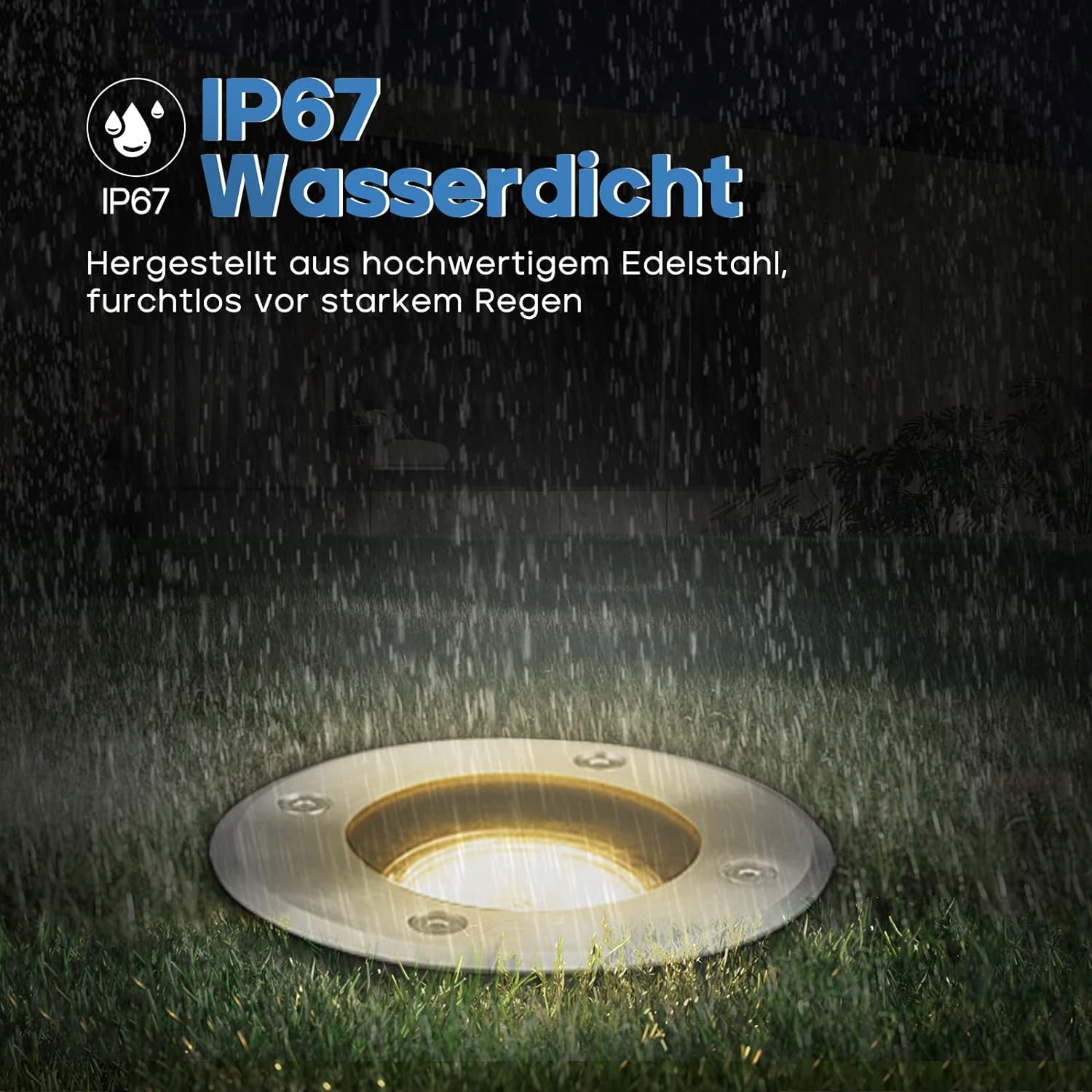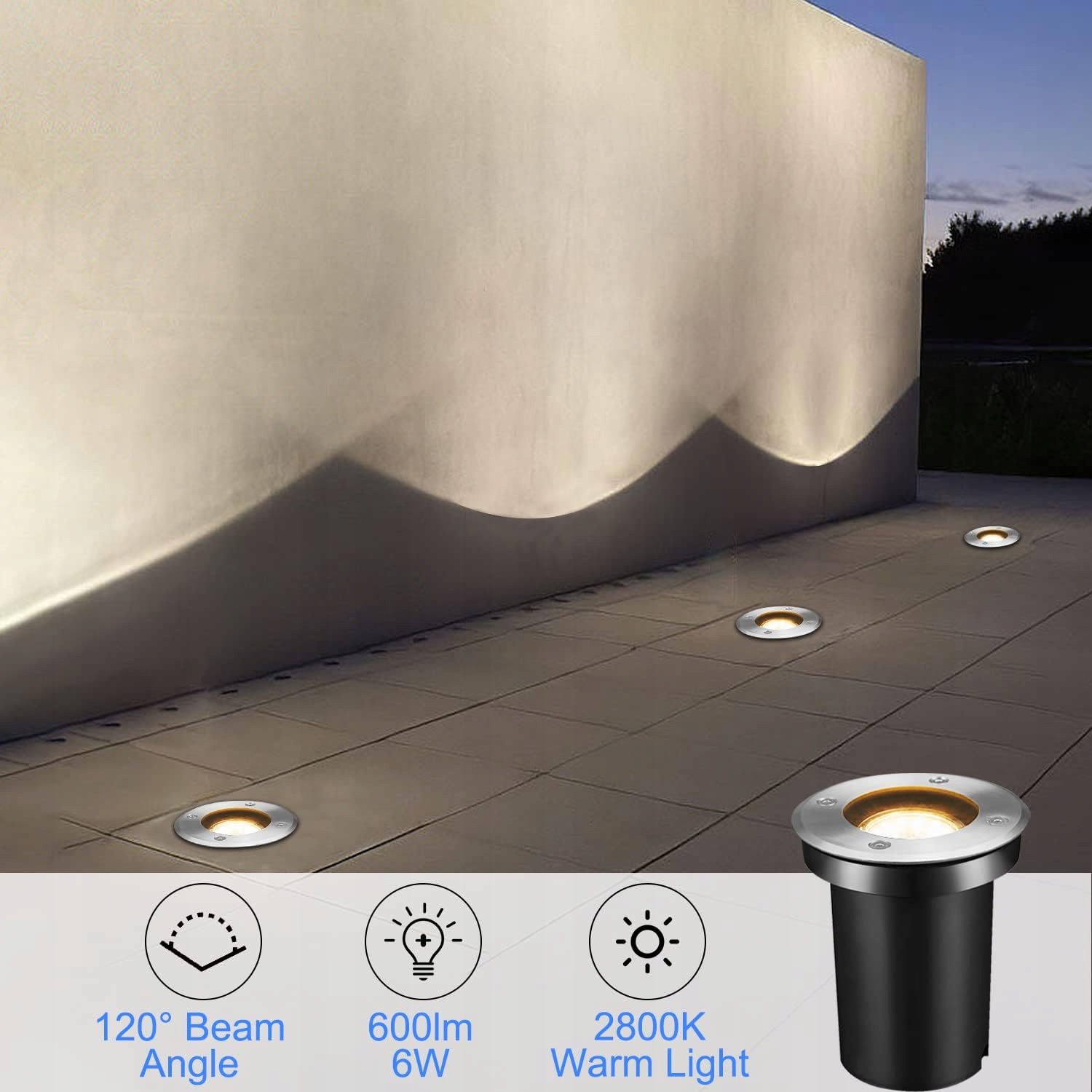В комплект входят: 4 водонепроницаемых светодиодных напольных светильника IP67 для патио, 4 лампы GU10, 6 Вт, цветовая температура: теплый белый 2700K. Эти уличные напольные светильники создают приятную атмосферу до поздней ночи.