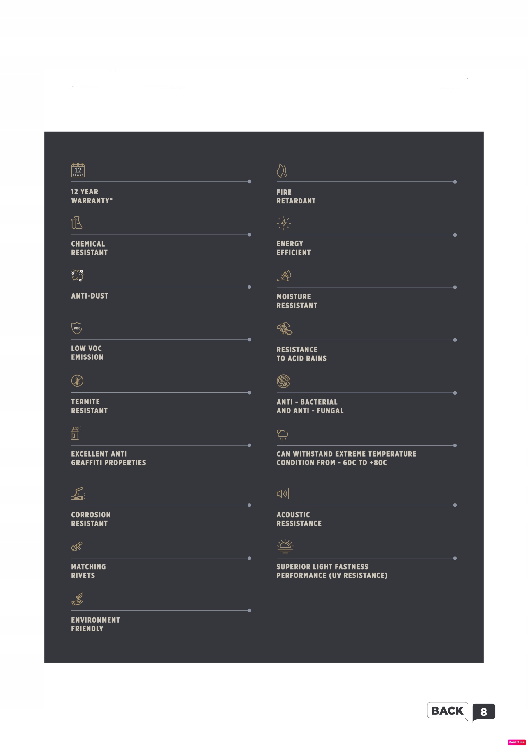 ➤ Облицовка очень устойчива к ультрафиолетовому излучению, присутствующему на солнечном свете, благодаря тому, что панели не теряют своего исходного цвета и тени под влиянием прямого солнечного света. Устойчивость к погодным условиям - Отлично обеспечивает стабильность размеров в различных экстремальных погодных условиях.