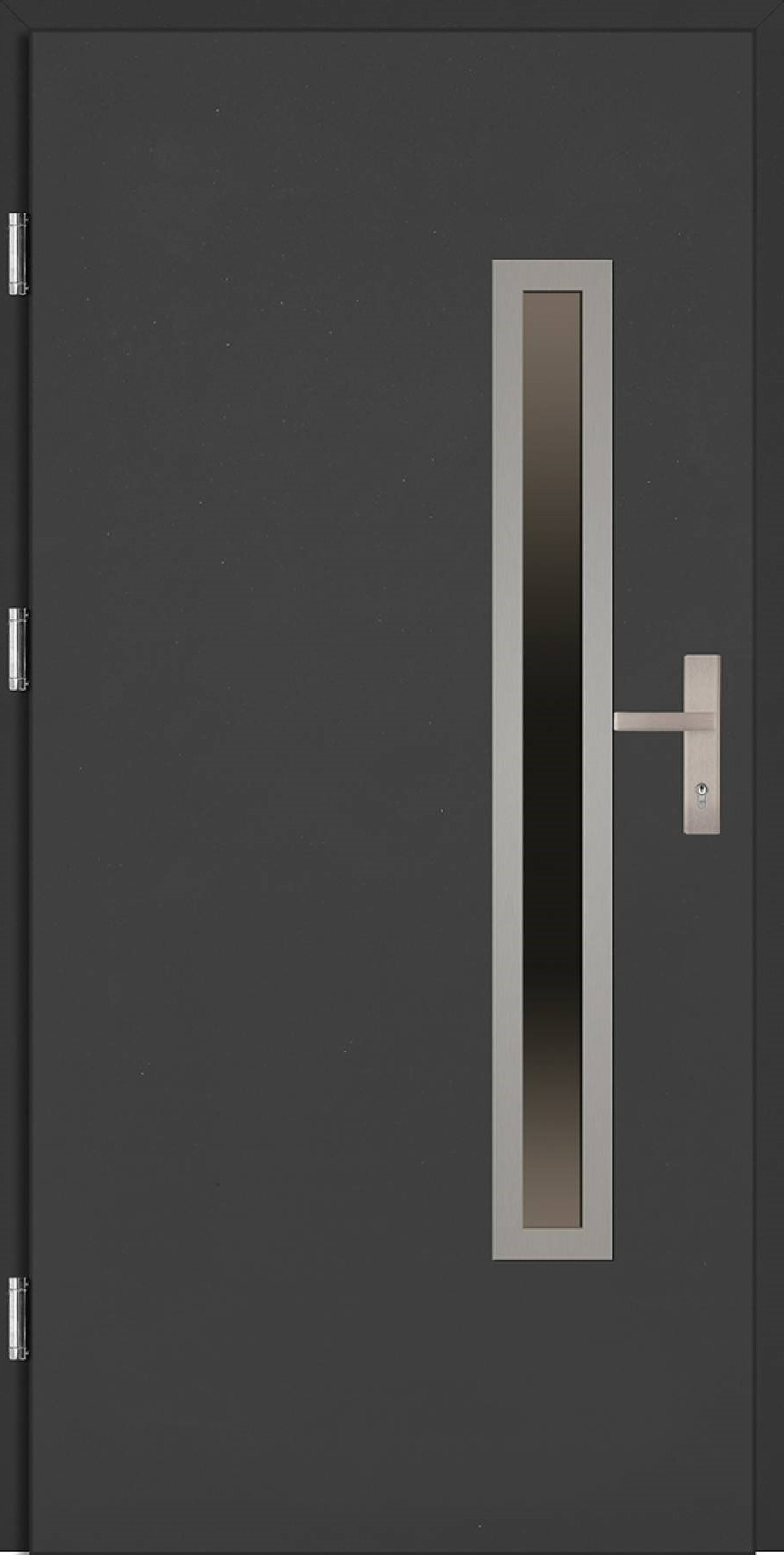 Дверь Dario Uno с толщиной створки 56 мм +/- 1 мм из оцинкованного листового металла, с порошковым покрытием антрацитового лака (грунтовка) RAL 7016. Поверхность дополнительно защищена защитной пленкой, которую следует снять сразу после установки двери. Наполнение двери выполнено из полистирола. В стандартной комплектации двери оснащены двумя штифтовыми замками с цилиндром 30/50.