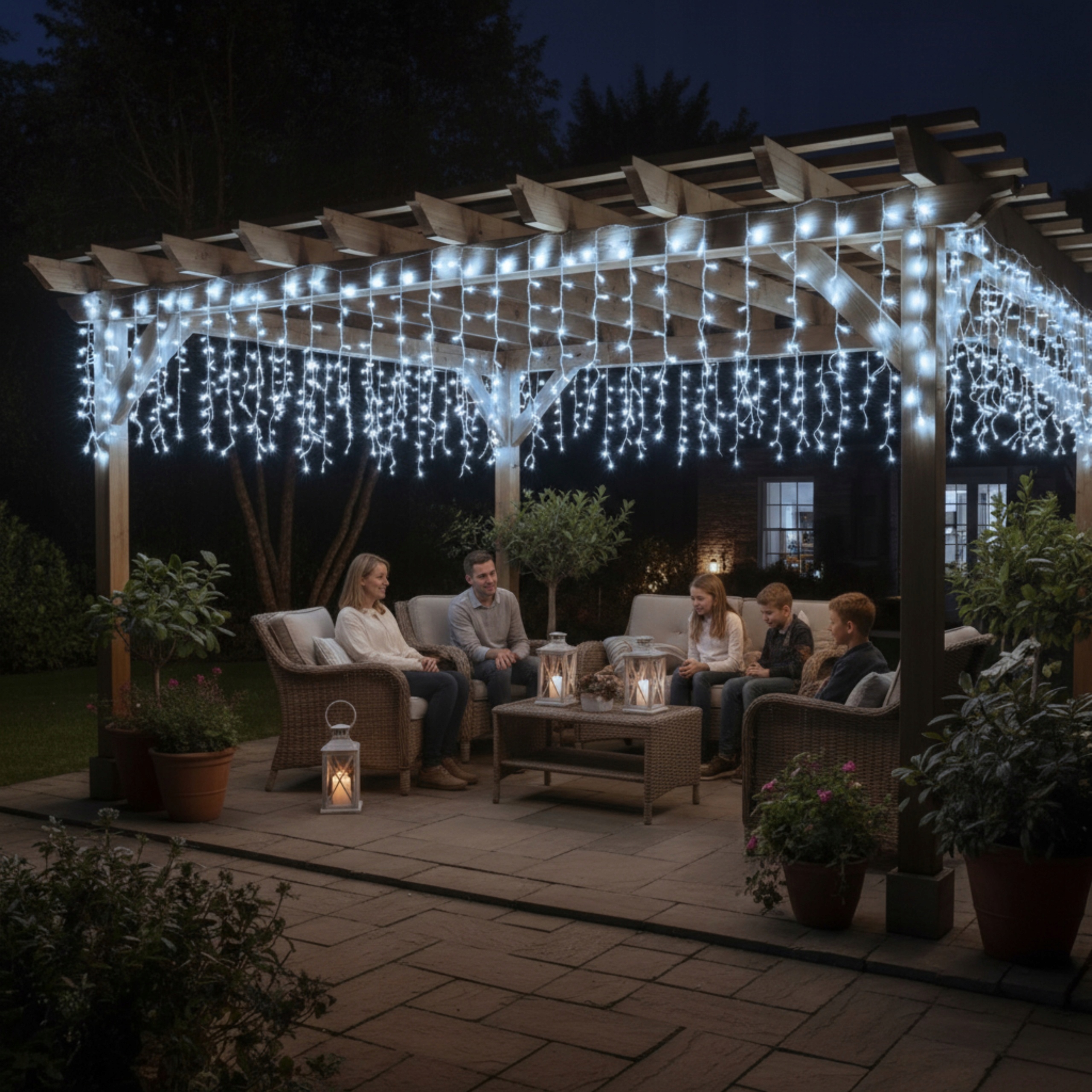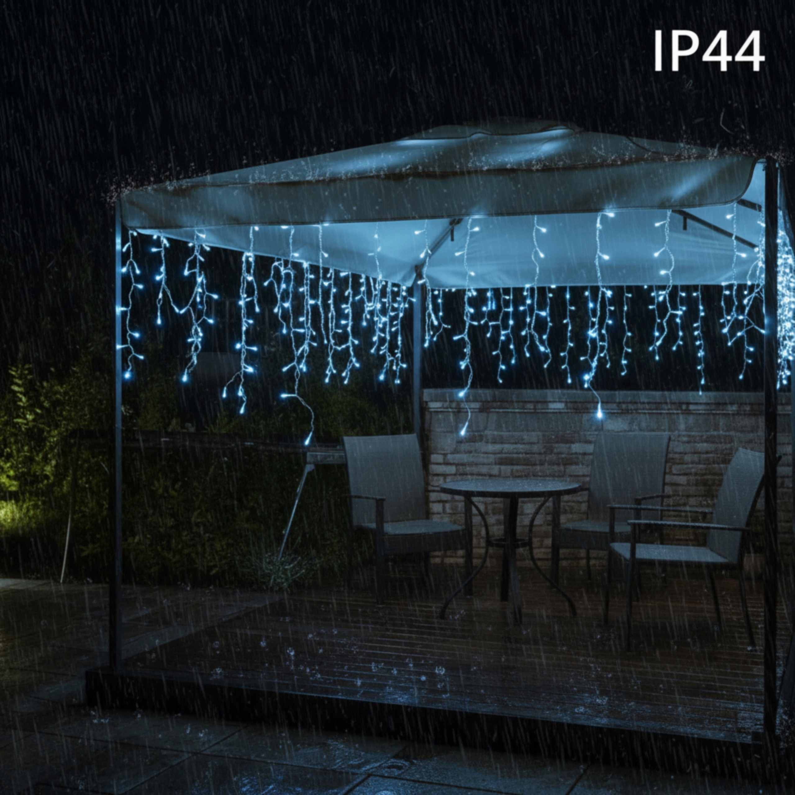 Вилка соответствует стандарту IP44, что гарантирует высокий уровень защиты от внешних факторов. Это означает, что комплект устойчив к влаге, брызгам и различным погодным условиям, что делает его идеальным для безопасной установки на открытом воздухе – на фасаде, балконе или в саду. Благодаря этому светильники могут надежно работать даже во время дождя или снега, обеспечивая стабильное и безопасное освещение на протяжении всего курортного сезона. Стандарт IP44 обеспечивает долговечность, безопасность и комфорт использования независимо от погоды.