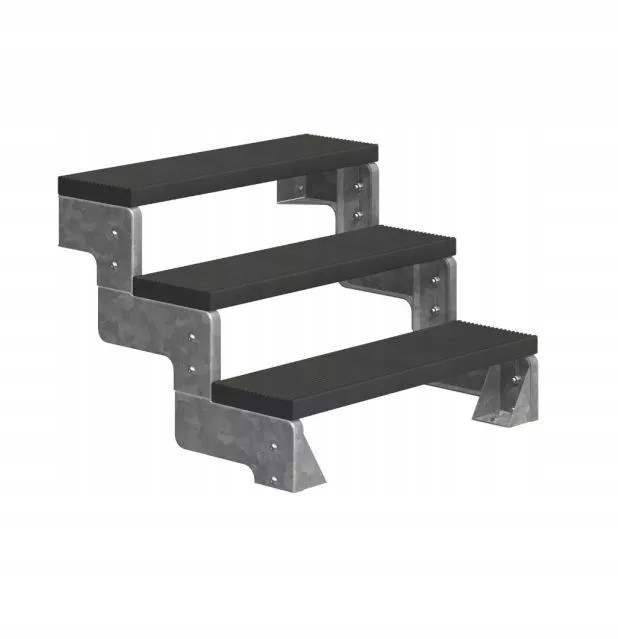Комплект состоит из конструкции из оцинкованной стали и 3 ступенек из антрацита Trimax®. Trimax® — это полносекционный пластик, армированный стекловолокном. Ширина ступеней 80 см, есть и более широкие – 100 см, и балюстрады для лестниц. Конструкция состоит из верхних и нижних опорных ножек конструкции, они позволяют прикрепить лестницу к земле и стене.