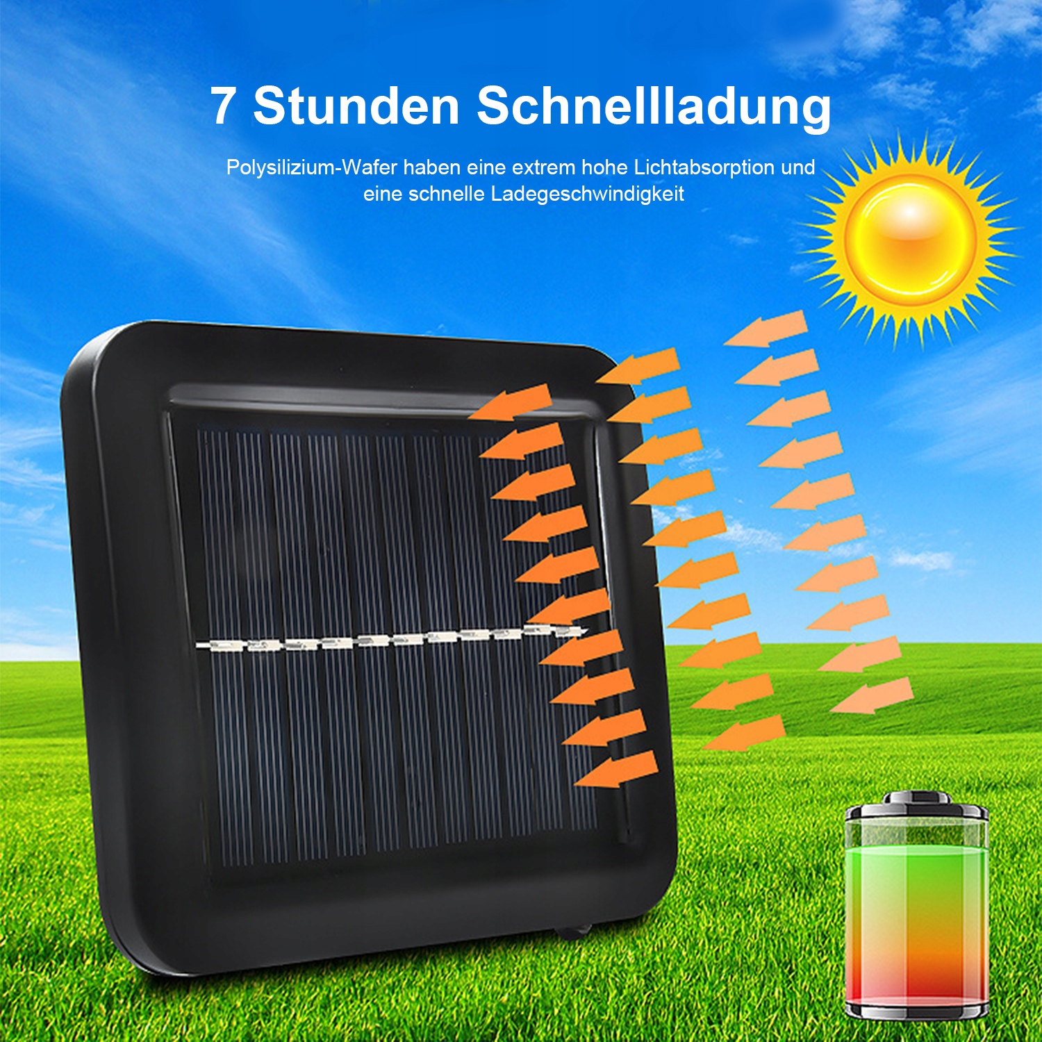 встроенная литий-ионная батарея с емкостью 1000 мАч позволяет эффективная зарядка с использованием солнечной энергии. Монокристаллический кремний обеспечивает Sun Performance до 20%. Более быстрая зарядка при прямом солнечном свете.
