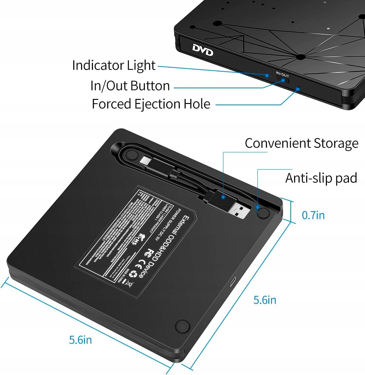 Внешний CD-привод весит всего около 350 г и имеет размеры 14,5 х 14 х 1,6 см. USB-кабель спрятан в задней части накопителя и изготовлен из высококачественного материала. Привод компакт-дисков можно легко хранить на открытом воздухе в сумочке или рюкзаке.