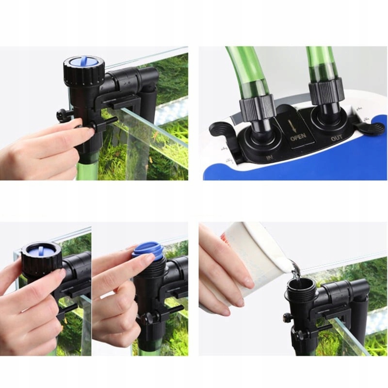 - Входные и выходные заливки и розетка -фильтр оснащен системой «аква-стоп», которая блокирует водоснабжение от фильтра в шланги и позволяет их отсоединять от крышки фильтра, что необходимо во время оказания помощи. Фильтр Sunsun HW-3000 имеет двойную воду в запуск-первая трубка, нижняя, берет воду из области ДНК, и его длина может регулироваться с использованием дополнительных сегментов Tuzzles. Это позволяет вам поддаваться примесям, лежащим на дне, которые часто ответственны за ухудшение качества воды. Этот элемент оснащен защитным ситом, поэтому вам не нужно беспокоиться о безопасности рыб, которые находятся в ее районе. Второй вход находится в форме поверхностного скиммера, который выводит воду с ее поверхности, удаляя белок и загрязнение, которое снижает качество воды. Специальная пробка используется для затопления шлангов