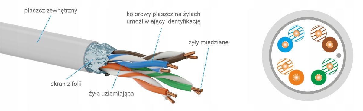 Экранированный кабель F/UTP (фольгированная/неэкранированная витая пара, маркировка в соответствии со стандартом ISO/IEC 11801). По всему центру кабеля размещен экран в виде алюминиевой фольги, а также между экраном и оболочкой находится заземляющий провод. Такая конструкция обеспечивает повышенную устойчивость к электромагнитным помехам (EMI), что позволяет обеспечить более высокое качество и безопасность передачи данных по сравнению с неэкранированными кабелями. Экран представляет собой ключевой экран, благодаря которому кабель передачи данных может располагаться в непосредственной близости от электрических и сигнальных кабелей и устройств, которые могут быть источником или переносчиком электромагнитных помех.
