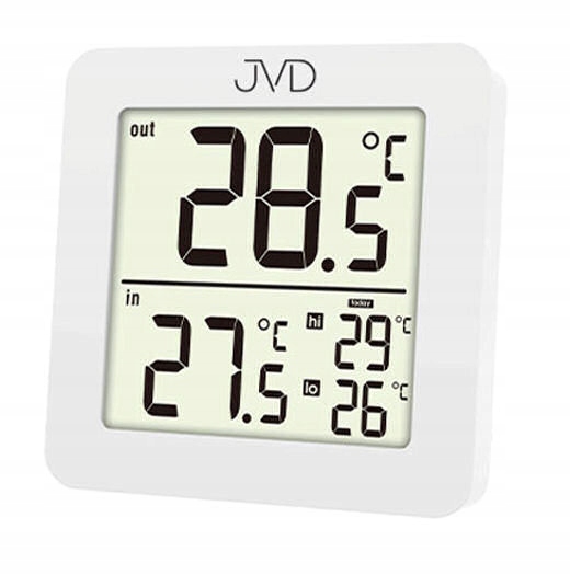 Цифровой термометр JVD T730 для наружного и внутреннего применения. Память минимальной и максимальной температуры. Внешний датчик на кабеле. Часы
