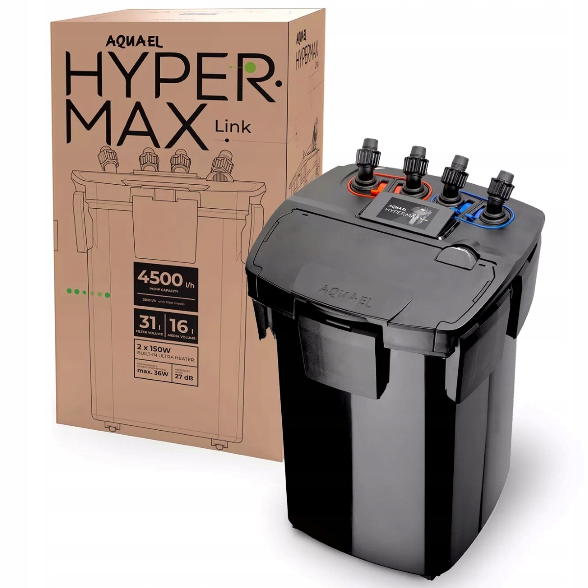 Aquael Hypermax Link — современный, высокоэффективный ковшовый термофильтр от польского производителя. Управляется через Wi-Fi. Предназначен для аквариумов объемом 200-1500 л. Обеспечивает эффективную механическую и биологическую фильтрацию. Встроенный предварительный фильтр ограничивает частоту очистки. Расход до 4500 л/ч. Мощность 18-36 Вт.