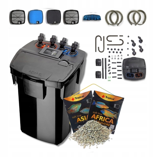 В комплект фильтров входят все необходимые для установки аксессуары. Входные отверстия фильтров защищены специальными корзинами, которые защищают даже самых маленьких обитателей наших аквариумов от случайного засасывания фильтром. К каждому входному отверстию прикреплена телескопическая трубка, длину которой можно регулировать в зависимости от высоты нашего аквариума. Выходные фильтры легко заменяются на входящие в комплект тропические души. Они обеспечивают лучшее распределение потока воды и эффективную оксигенацию резервуара.