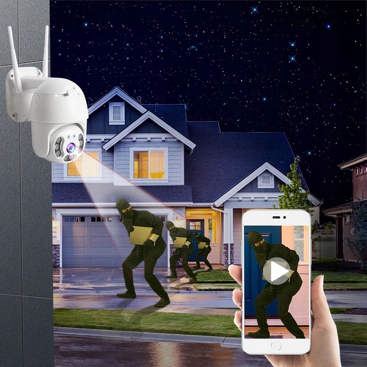 Беспроводная PTZ IP-камера Водонепроницаемая 4-кратная цифровая купольная камера со скоростью масштабирования Супер 1080P Wi-Fi Безопасность CCTV высочайшее качество изображения. Двустороннее обнаружение звука. Датчик движения, который сообщает нам на нашем смартфоне, что кто-то движется в нашем районе.