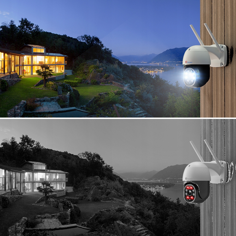 - ⭐Этот Wi-Fi PTZ-датчик оснащен 4 ИК-светодиодами и 4 отражателями. Камера обеспечивает ночное видение HD 5 Мп в трех режимах: цветном, автоматическом и ИК. Цветное ночное видение имеет дальность действия до 20 метров, а инфракрасное ночное видение — до 25 метров.