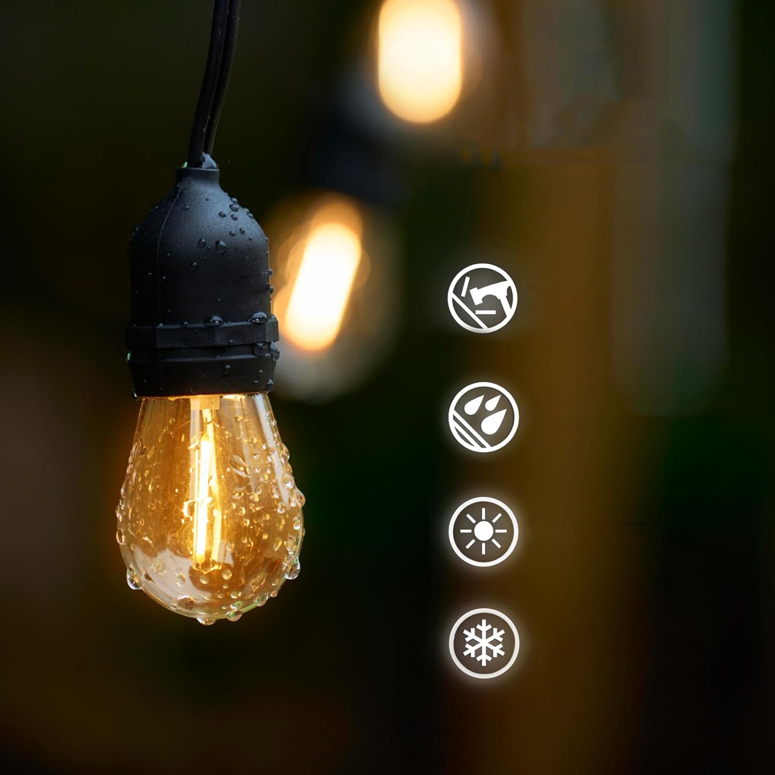 Girland были разработаны для долговечности и функциональности 💪. Толстый черный кабель устойчив к погодным условиям 🌧, а пластиковые лампочки не являются, и светлыми - идеально подходит для снаружи! 💼🌳 Благодаря классу сжатия IP44 Girland не боится дождя или влаги 💦.