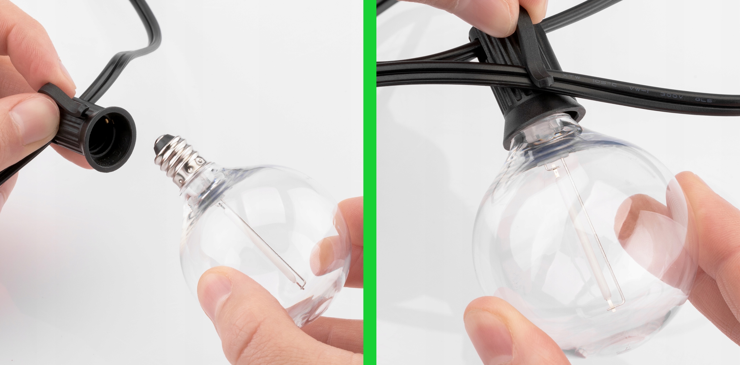 Каждая лампочка имеет фиксированный держатель (крючок), позволяющий регулировать длину и плотность световых точек по всей длине.