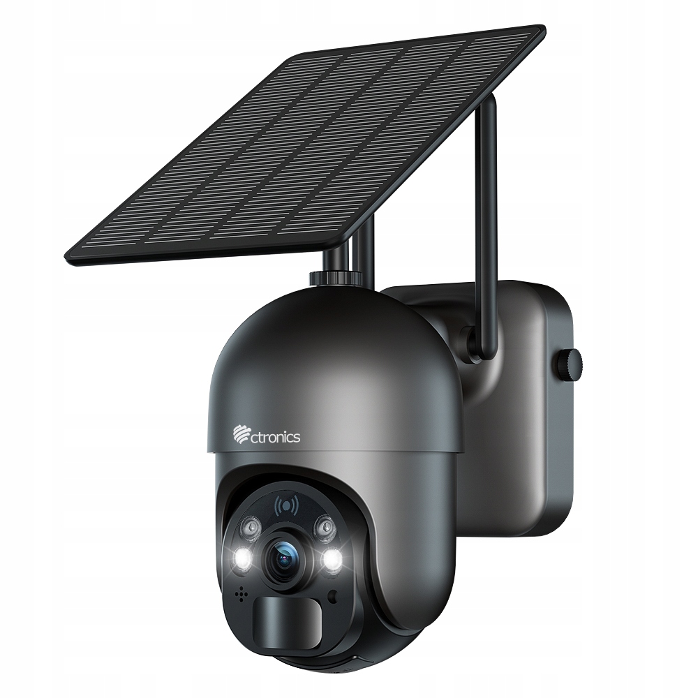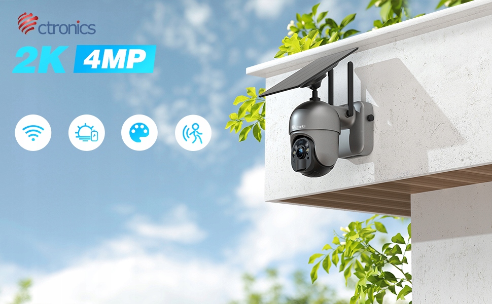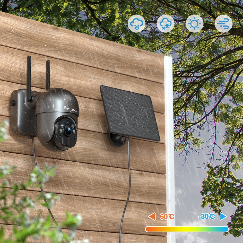 Солнечная камера Ctronics для улицы, Wi-Fi, поворотная, 2K, 4 МП, 2560 x 1440P, аккумуляторы 8000 мАч, PTZ, 355°/95°, IP66, черный