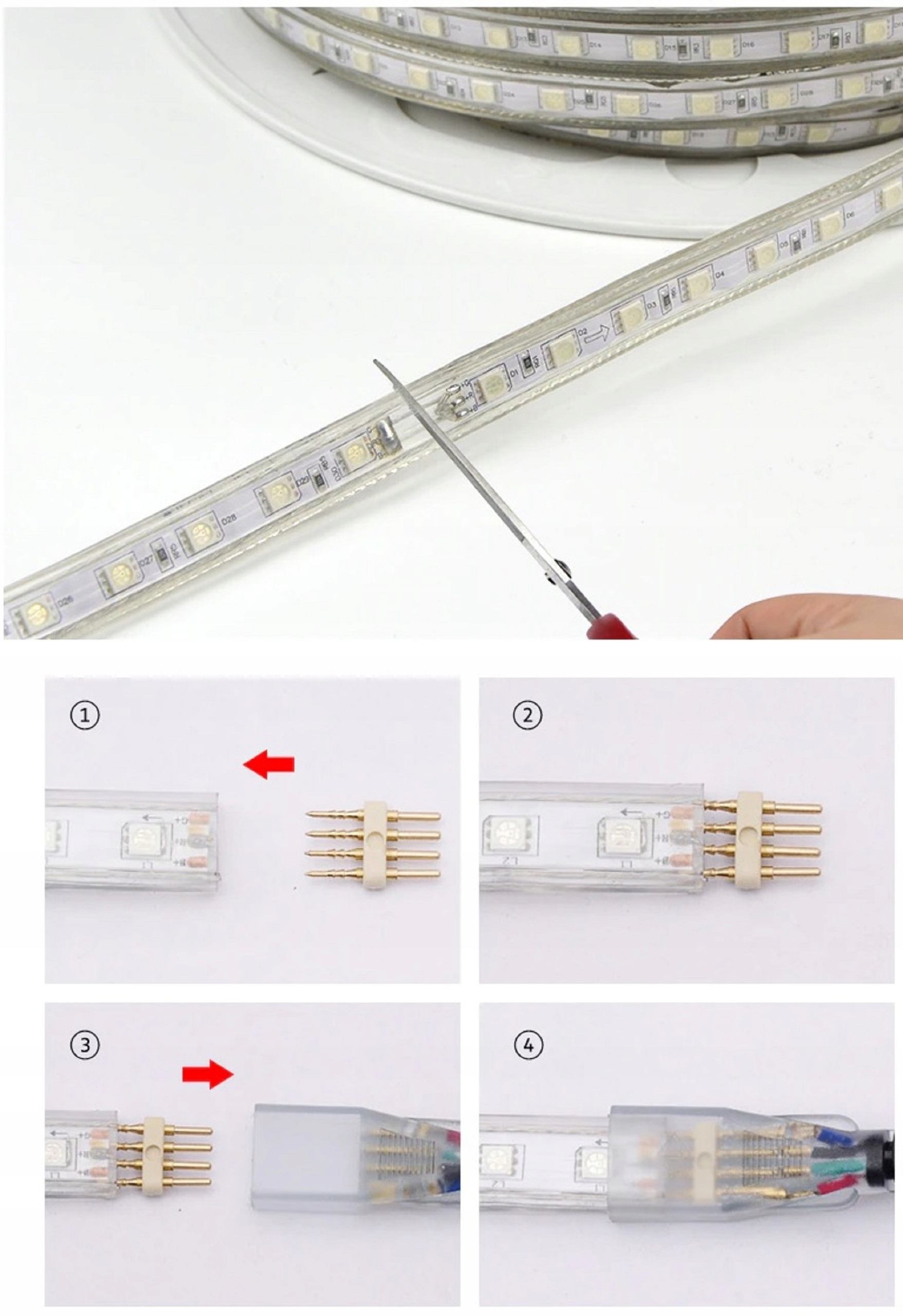 На следующих фотографиях показан метод установки ленты. Из -за напряжения 230 В, при сборке и в случае сомнений следует принять особое осторожность, и в случае сомнений закажите установку на квалифицированного электрика с соответствующими разрешениями.