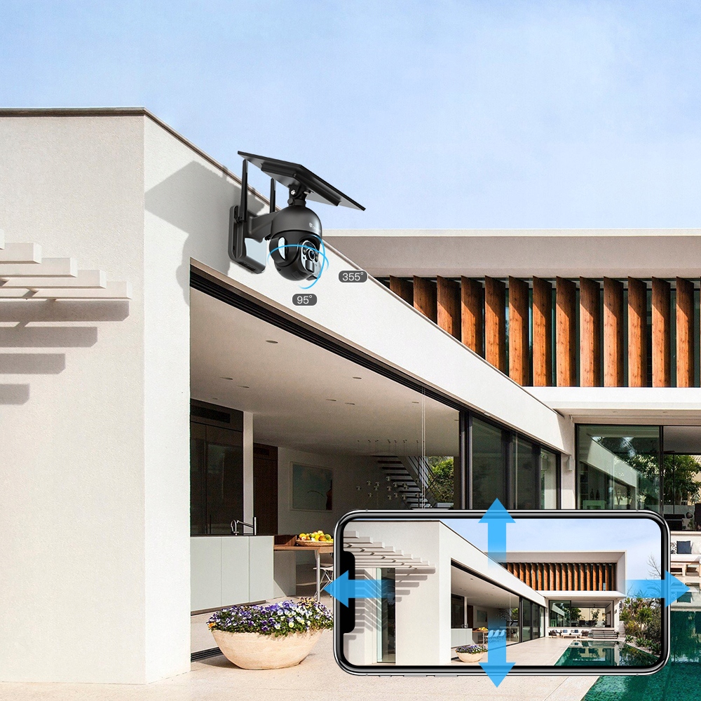 - ⭐Интеллектуальное панорамирование на 355° и 95° функция наклона позволяет вам контролировать вращение аккумулятора вашей камеры наружного наблюдения, чтобы видеть со смартфона во всех направлениях.