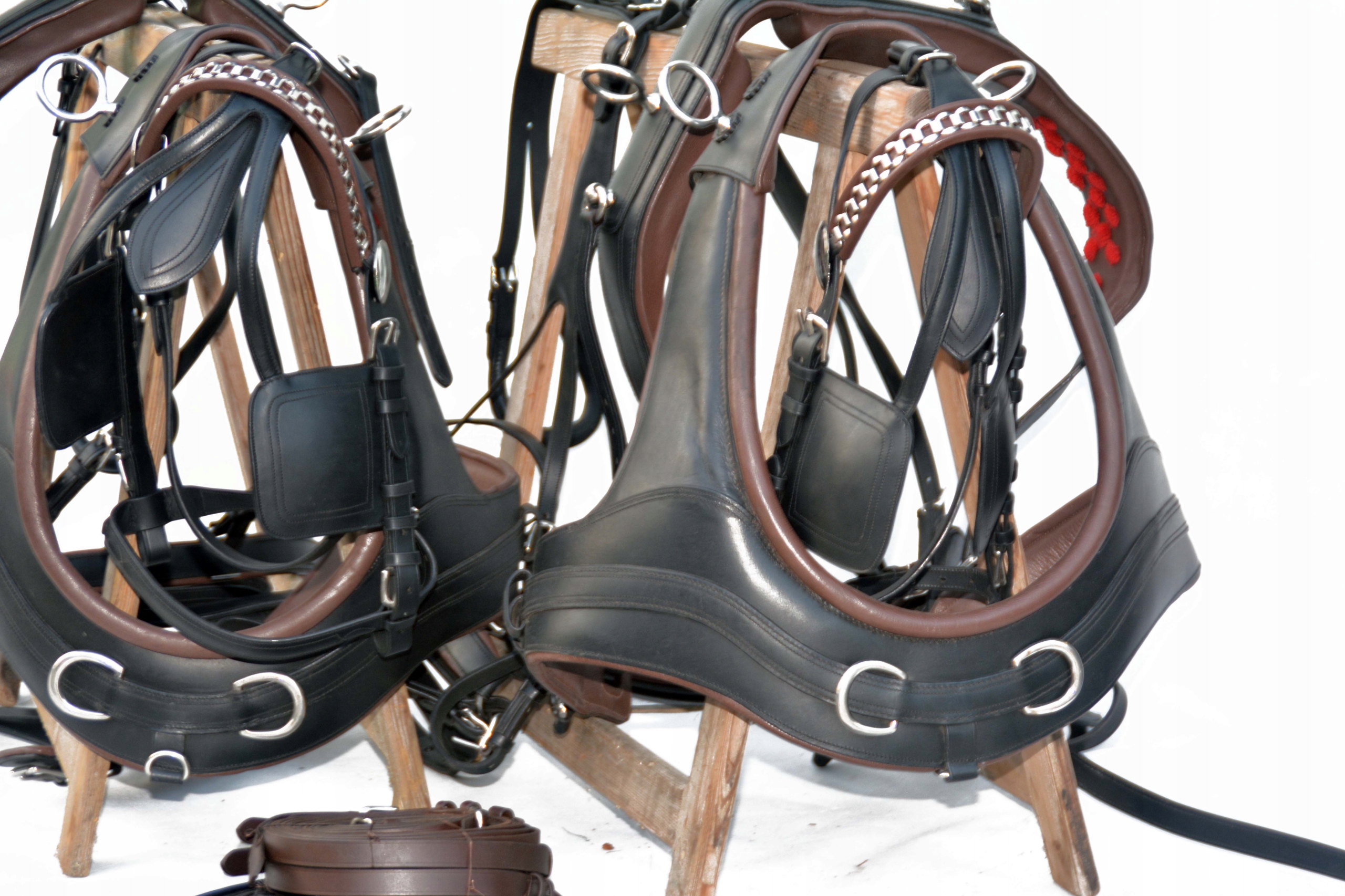 Французская упряжь для пары лошадей размера COB. Шлейка полностью изготовлена из очень хорошей, отборной натуральной кожи, очень мягкой и приятной на ощупь, с вшитыми тесьмами во всех элементах шлейки для укрепления кожи.Профилированная грудь оснащена нагрудниками, анатомически профилированные подпруги, анатомические уздечки в затылочная часть и мягкий капсюль.Фурнитура из нержавеющей стали,единственная шлейка такого типа на рынке,сделана отлично.Рекомендую