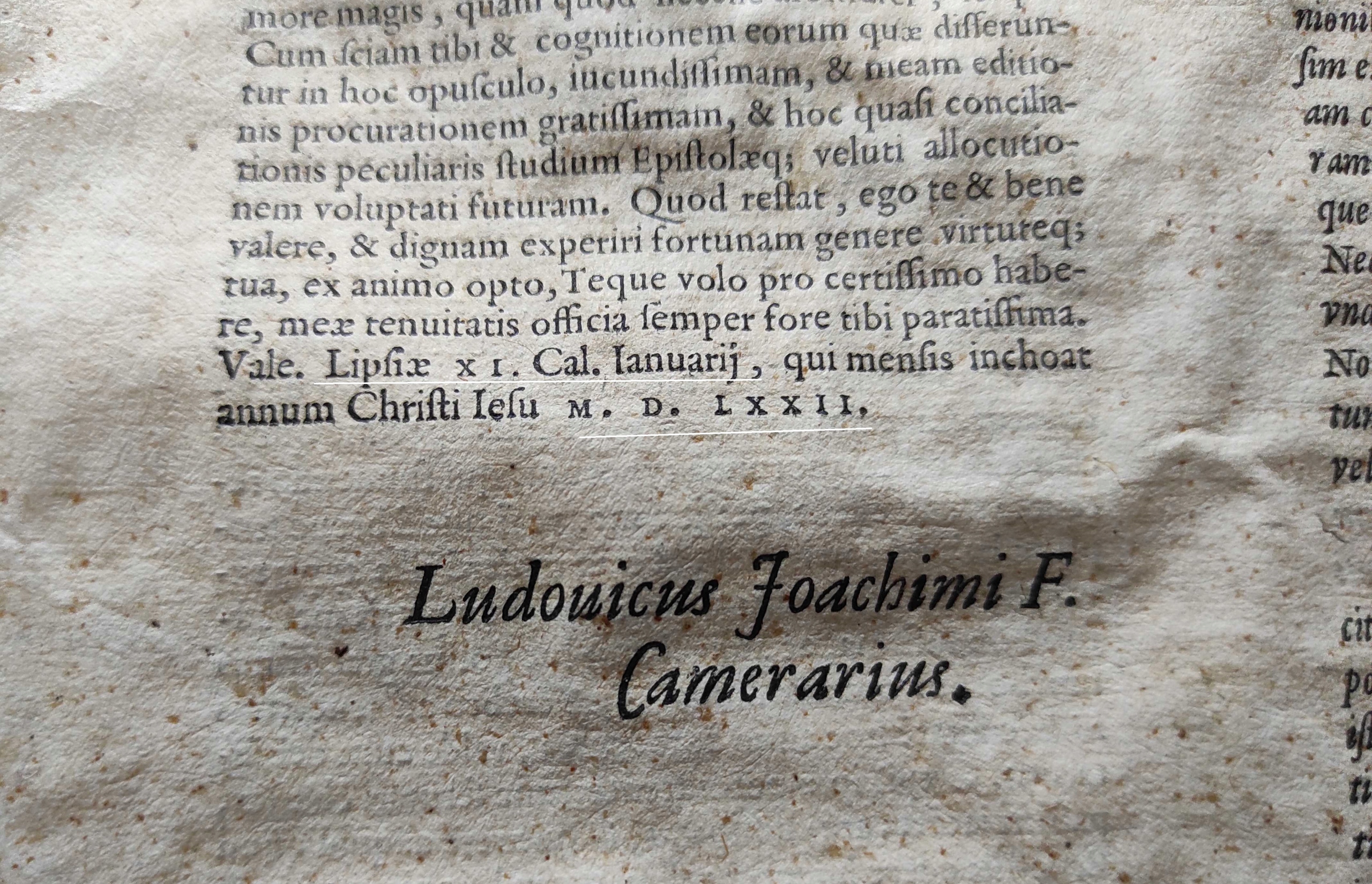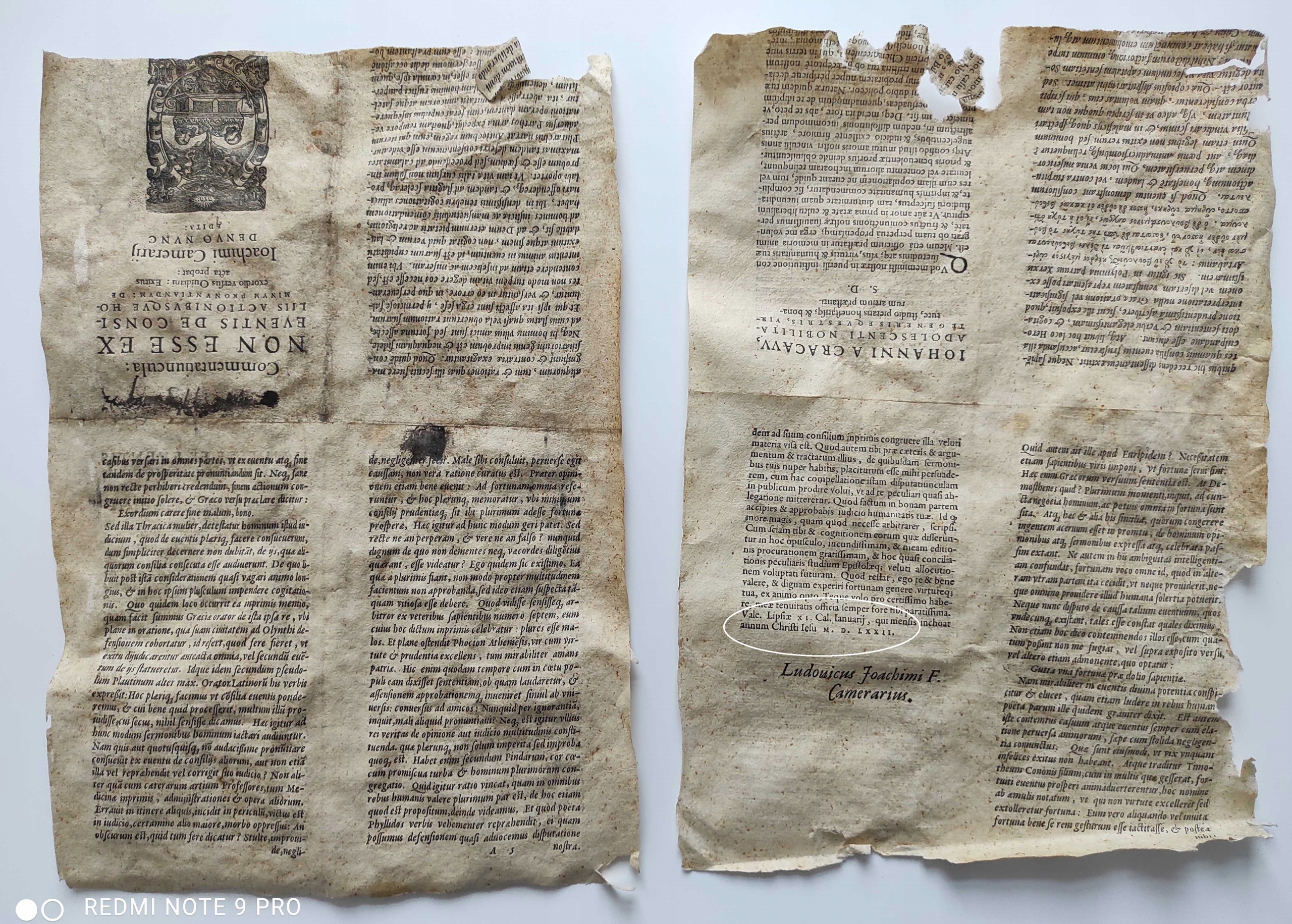 2 карты, напечатанные с обеих сторон - каждая карта представляет собой один полиграфический комплект, содержащий 8 страниц печати. Один из них имеет датированное предисловие - Лейпциг 1572 г., а другой - обрезанный титульный лист с печатью принтера. Это фрагменты работы Иоахима Камерариуса: Commentatiuncula:|| NON ESSE EX E=||VENTIS DE CONSILIIS || ДЕЙСТВИЕИБВСК; HOMINVM ||pronuntiandum: de exordio против || Уидиани: Exitus acta || пробат:|| Иоакими Камерарий.|| ([Hrsg.v.] Ludouicus... || Камерариус.||), Типография: Эрнст Фёгелин, Лейпциг 1572. Иоахим Камерариус был лютеранским гуманистом - родился 4.12.1500 в Бамберге, умер 17.4.1574 в Лейпциге. Он знал Дюрера, Меланхтона и Лютера. Он обсуждал возможность религиозного союза с императором Максимилианом II в Вене. В 1535 г. он был профессором Тюбингенского университета, а с 1541 г. работал в Лейпцигском университете, будучи его ректором, что сделало его одним из лучших в Германии. Там он работал до конца своей жизни.