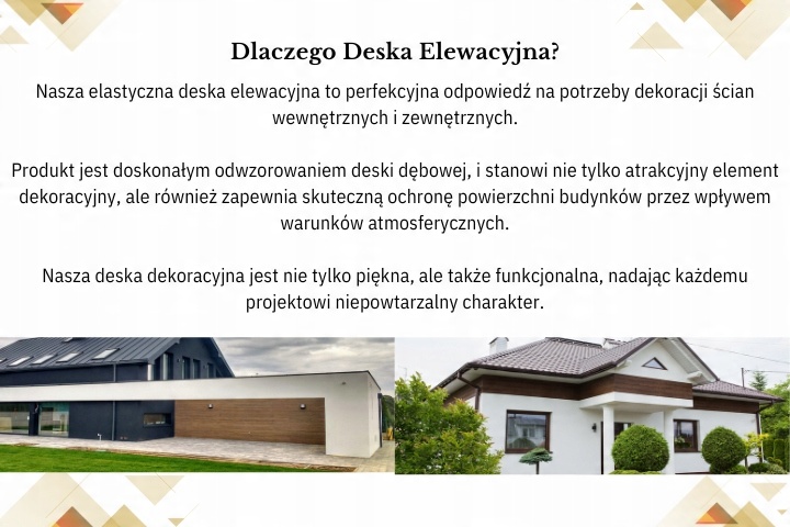 Плиты предназначены для отделки внутренних и наружных стен, представляют собой очень реалистичную копию натуральных дубовых досок, которые можно использовать в качестве декоративных элементов на фасаде здания, в жилых помещениях и общественных объектах, таких как: магазины, рестораны, офисы, гостиницы и т. д. Их использование подчеркивает особый характер как фасада, так и интерьера, защищая его от атмосферных воздействий и повышая долговечность облицованной поверхности.
