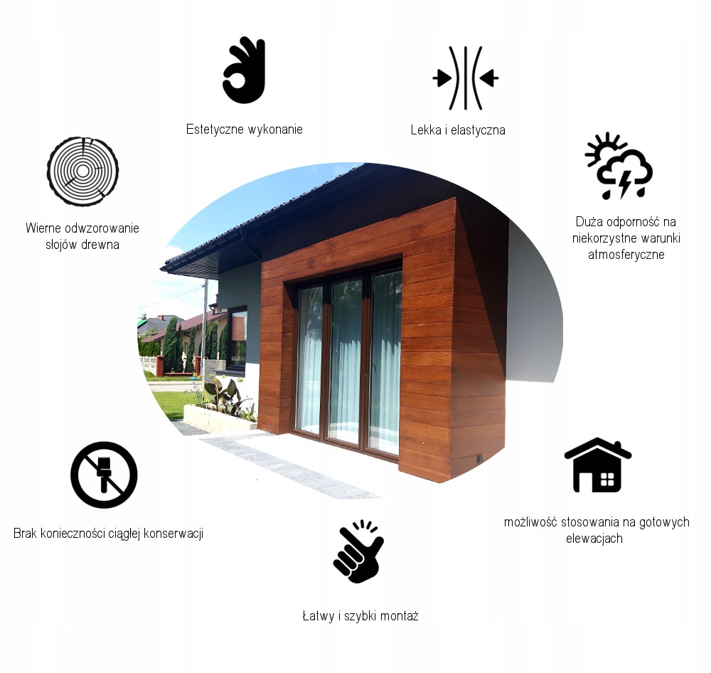 Наш продукт устойчив к изменяющимся погодным условиям (дождь, мороз, УФ-излучение). лучи), нет необходимости в постоянном уходе, очень реалистичная структура натурального дерева и возможность использования на готовых фасадах. Это готовое изделие для непосредственной сборки