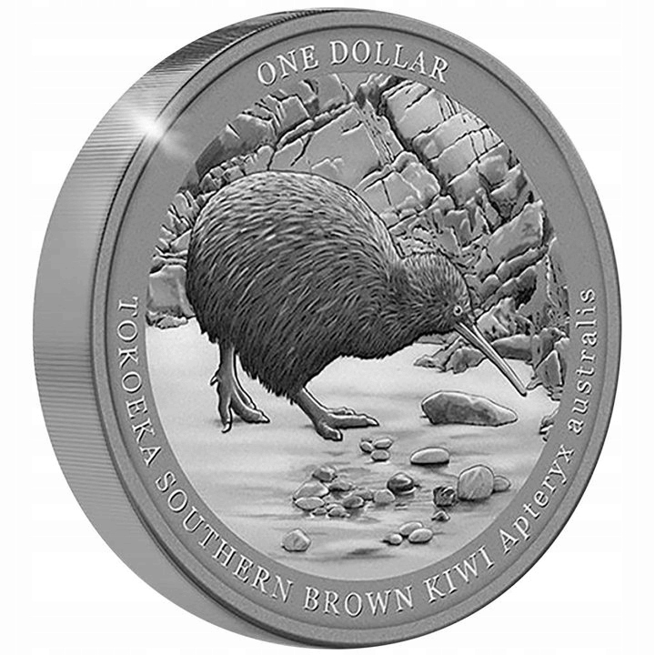 Коллекционная монета Киви 1 унция Серебро 2023 г. Образец — уникальная монета из лимитированной серии Киви, выпускаемая с 2004 года. На товаре 2023 года изображен южный киви из семейства Apteryx australis. Этот вид встречается, в частности, на острове Стюарт, Фьордленд. Для него характерно серо-коричневое оперение с перьями в продольную полоску.