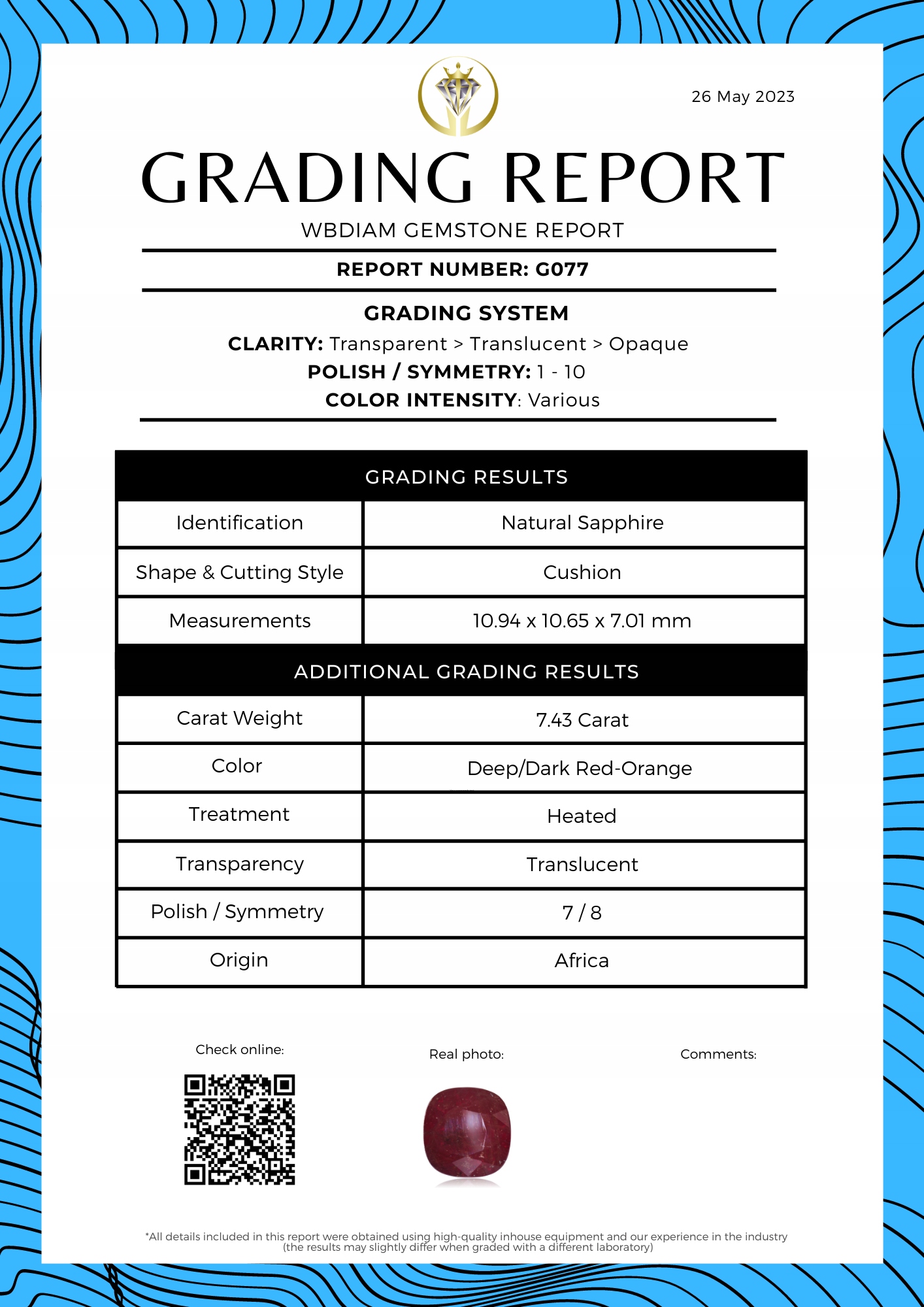 Сертифицировано WBDIAM – НОМЕР ОТЧЕТА: G077 – сертификат предоставляется в цифровом виде (PDF)