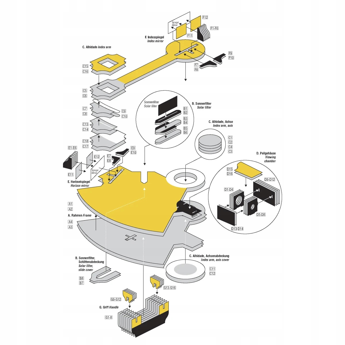 - 2 листа лакированного картона толщиной 1 мм, содержащие элементы для построения секстанта; высечка позволяет снимать элементы не разрезая