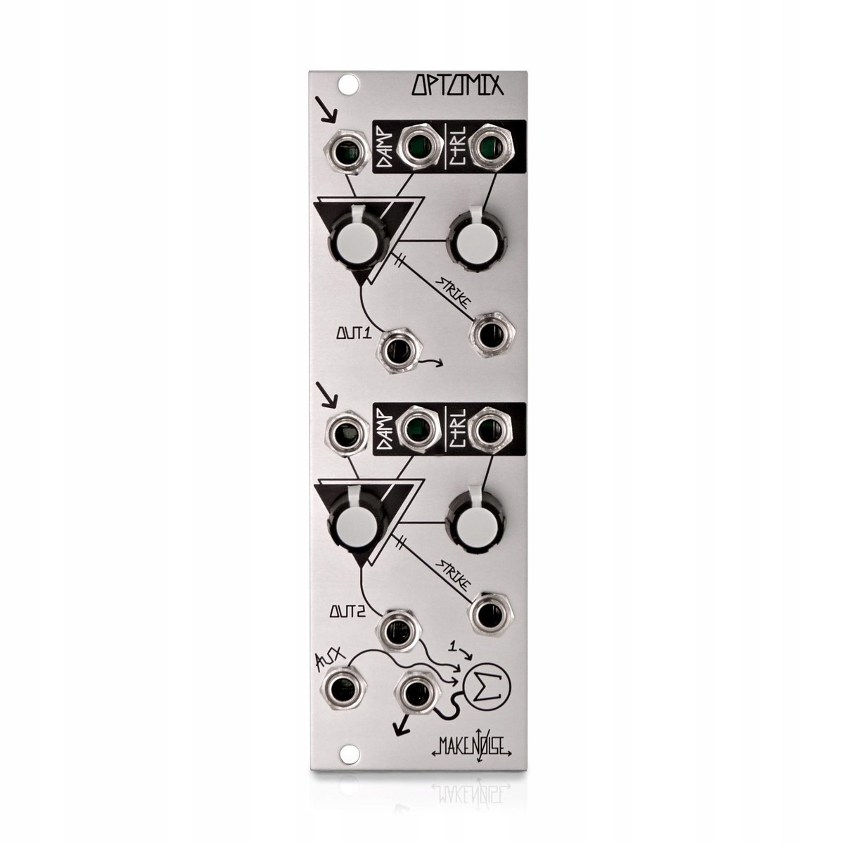 Модуль музыкального синтезатора Mąkę Noise Optomix представляет собой двухканальный вентиль нижних частот, обеспечивающий одновременное управление напряжением амплитуды и частоты сигнала. По сути, это усилитель с фильтром, управляемым напряжением (VCFA), который имеет чрезвычайно органичный отклик на управляющие сигналы. Low Pass Gate — это классическая схема синтеза Западного побережья, которая в версии 2 добавляет сжатие звука Side Chain и расширяет возможности генерации и обработки CV.