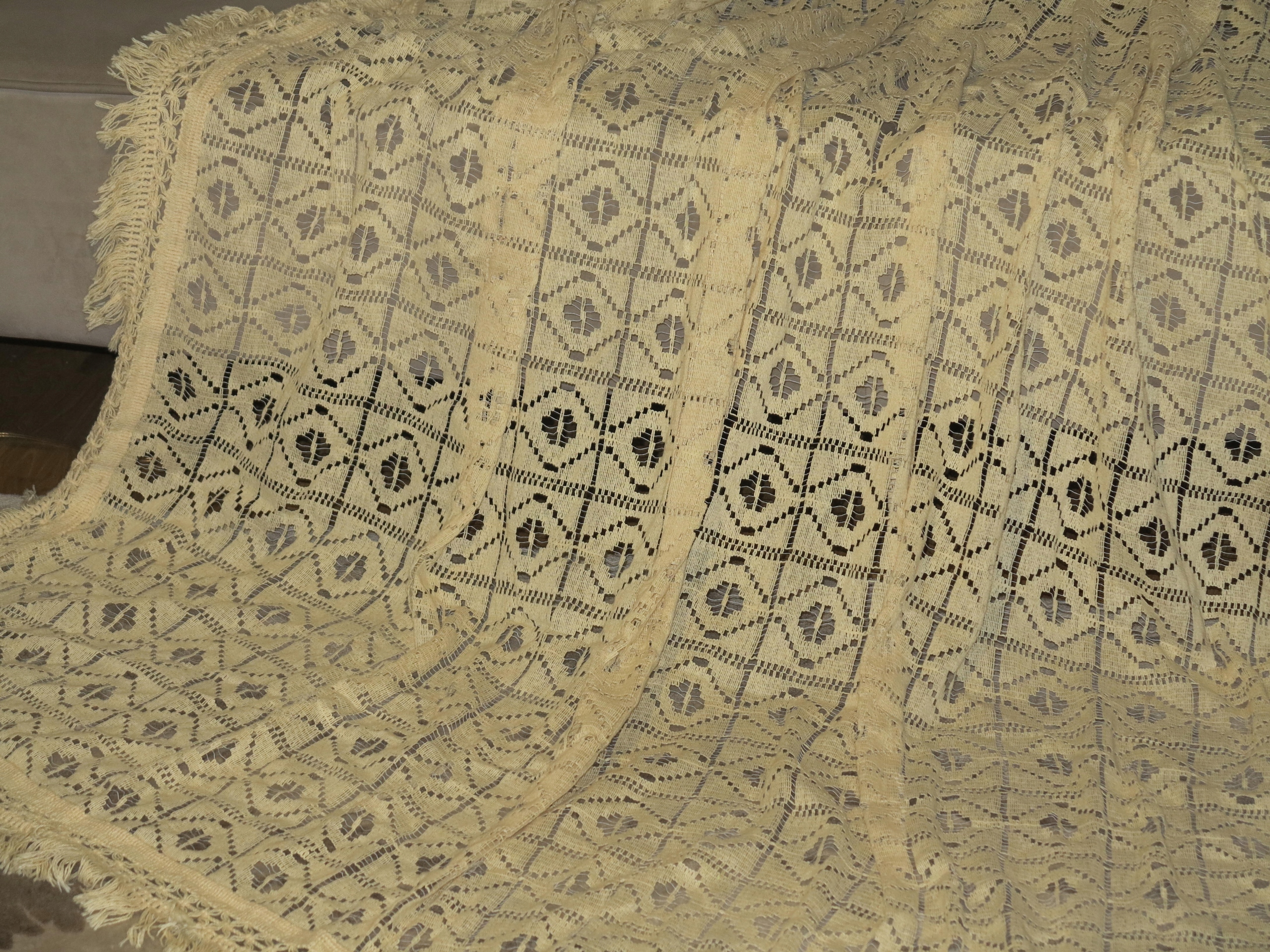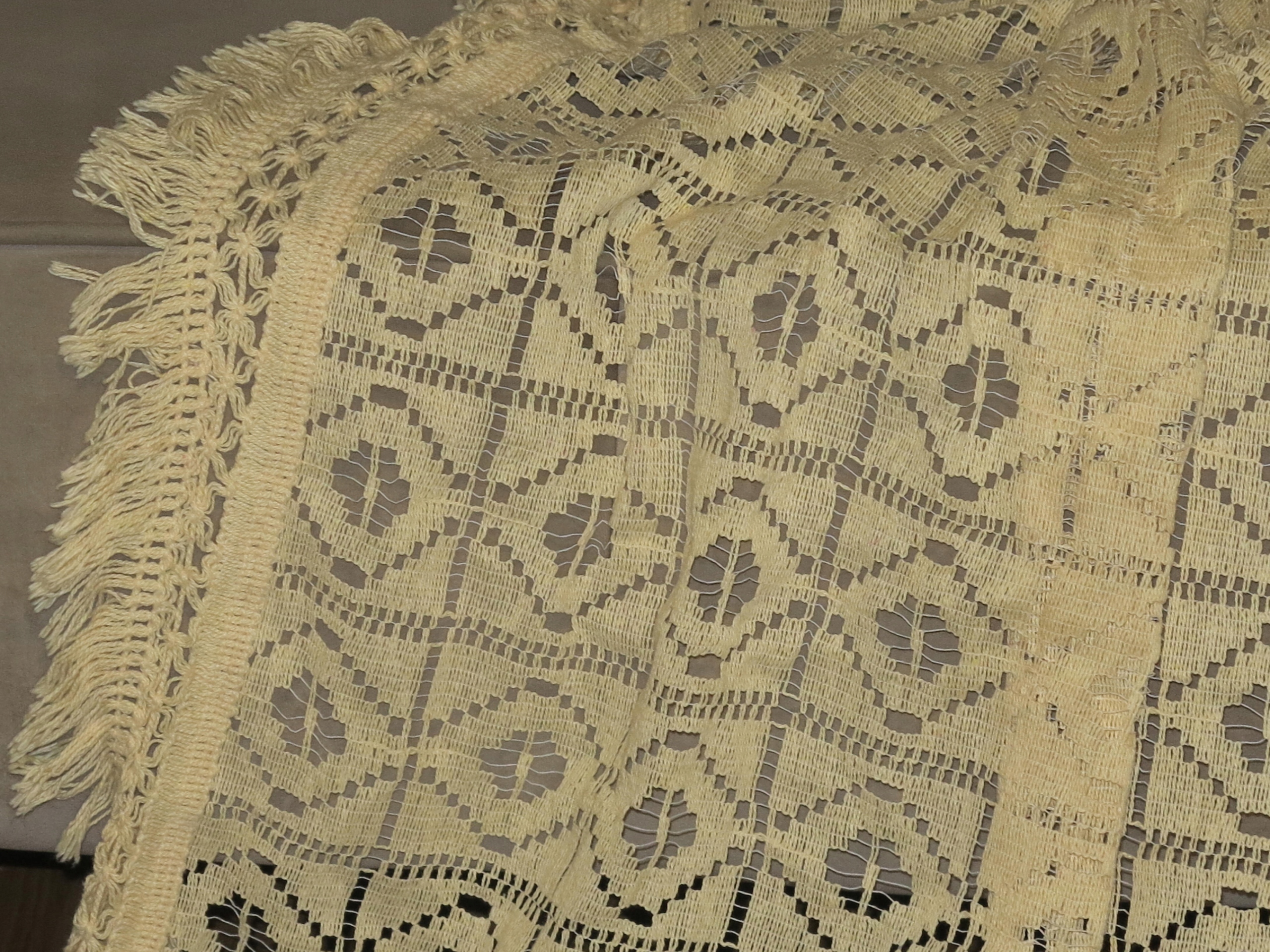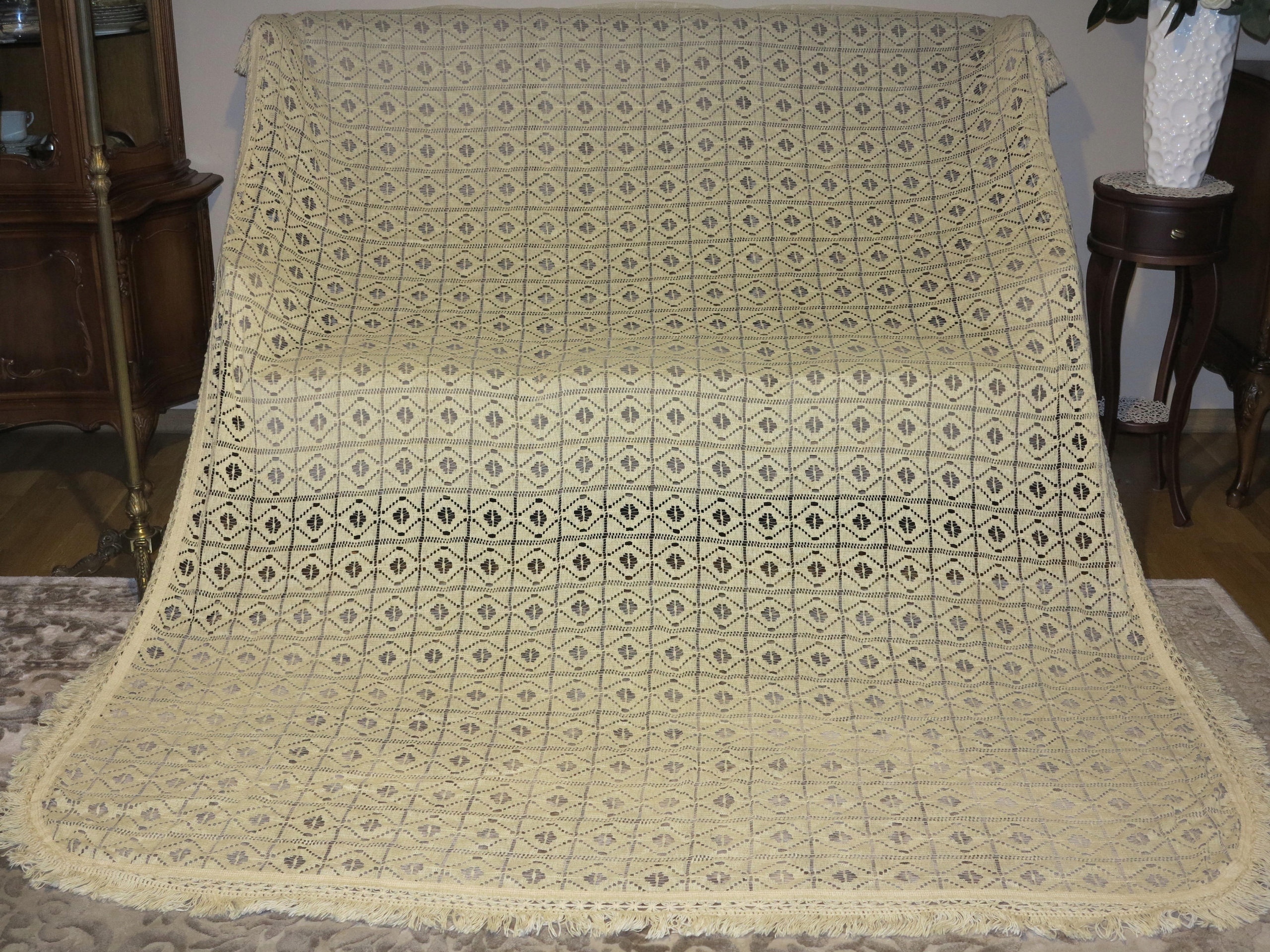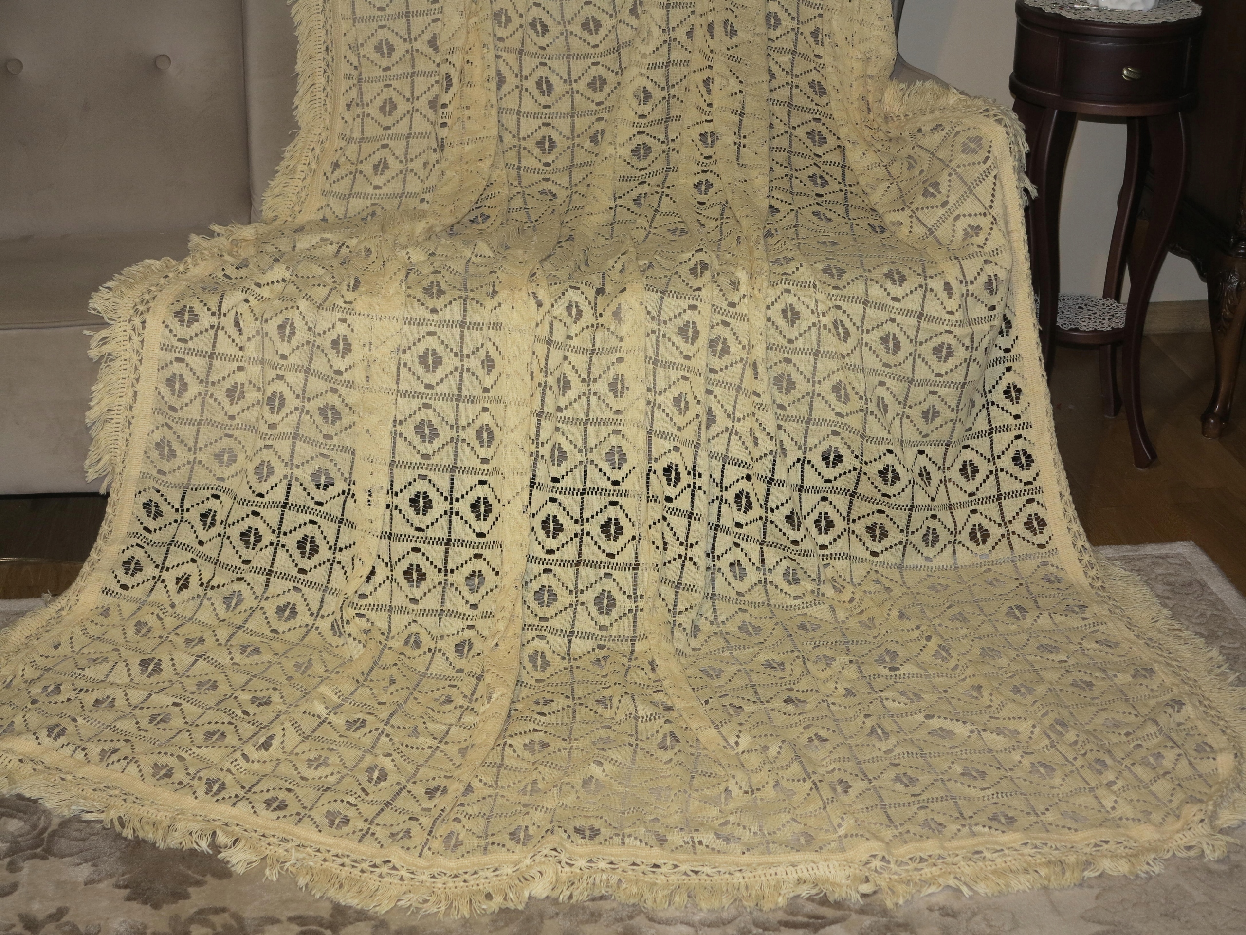 Предмет На аукционе представлено красивое старинное испанское кружевное покрывало для двуспальной кровати с закругленными нижними углами и бахромой. Покрывало б/у, в очень хорошем состоянии. Рекомендую, уникальная, красивая вещь.