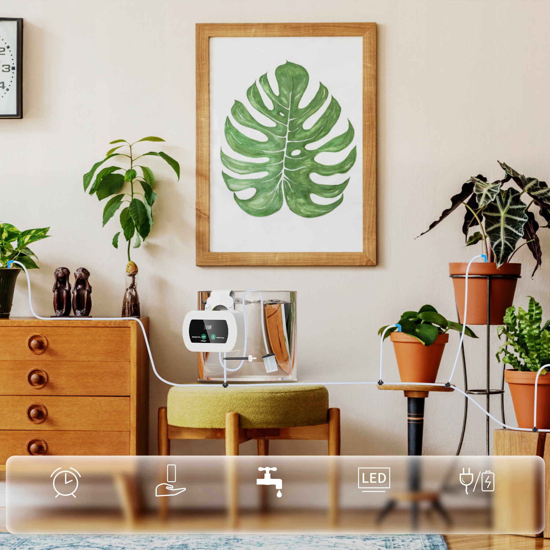 Система автоматической ирригации капель использует интерфейс зарядки USB-C, который обеспечивает большее удобство и совместимость. Эту ирригационную систему капель может быть помещена в комнату, на балконе, в теплице и в других местах, где можно получить автоматическое орошение. (ПРИМЕЧАНИЕ: не ставят на улицу!)