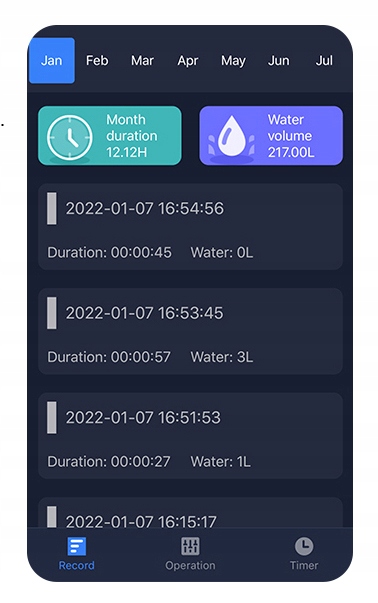 - История использования воды записывает подробную информацию об открытии водяного клапана, включая время и количество воды, использованной для каждого полива.