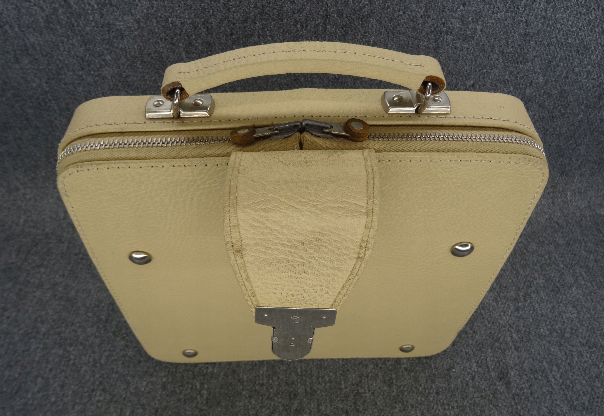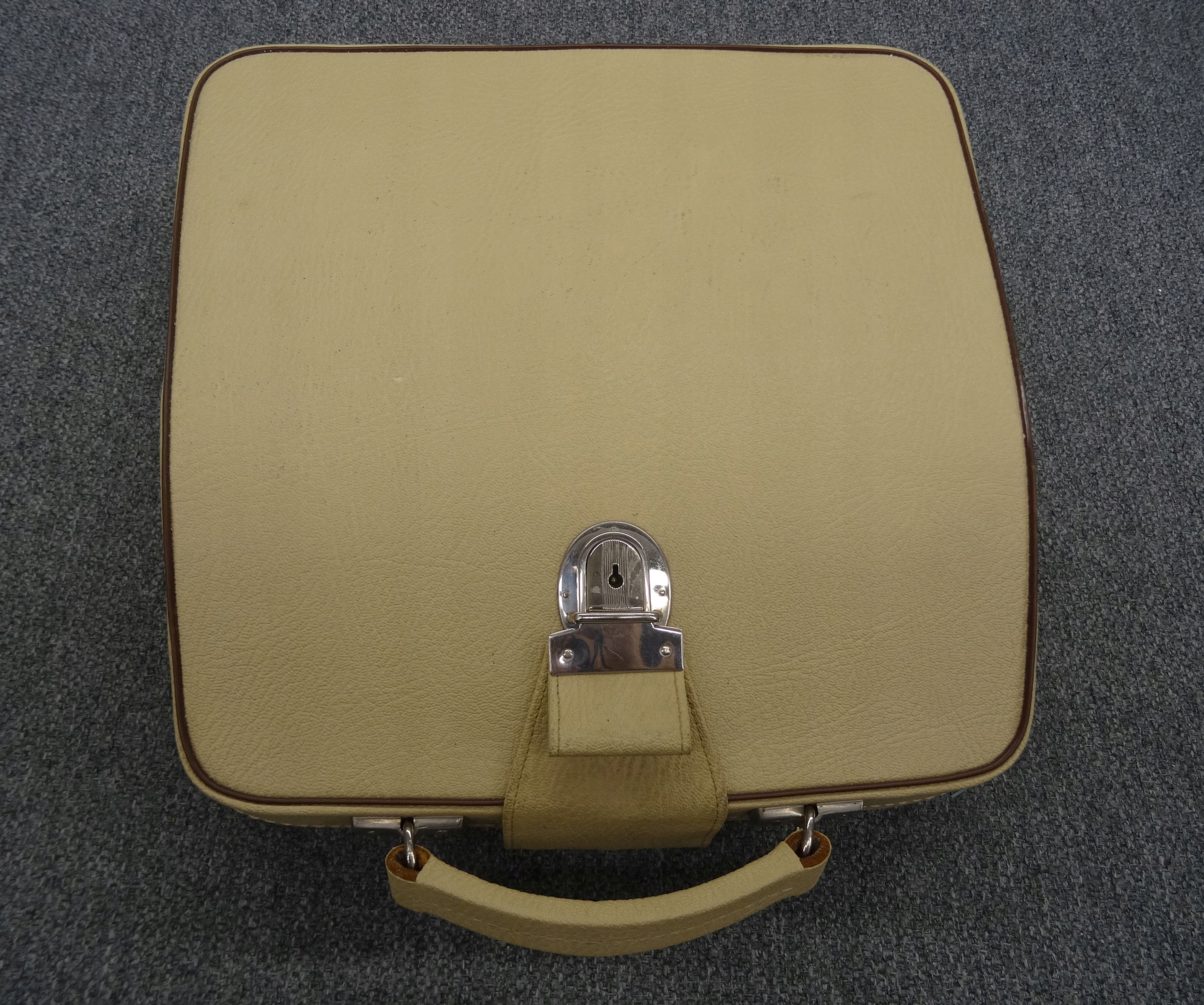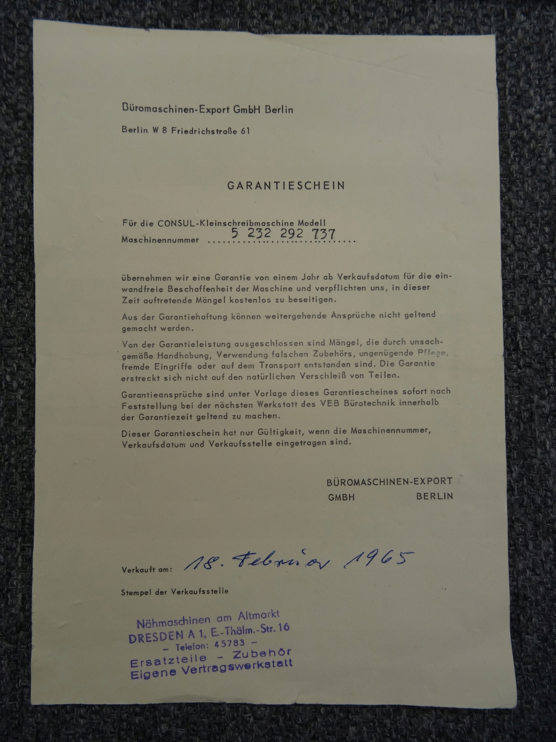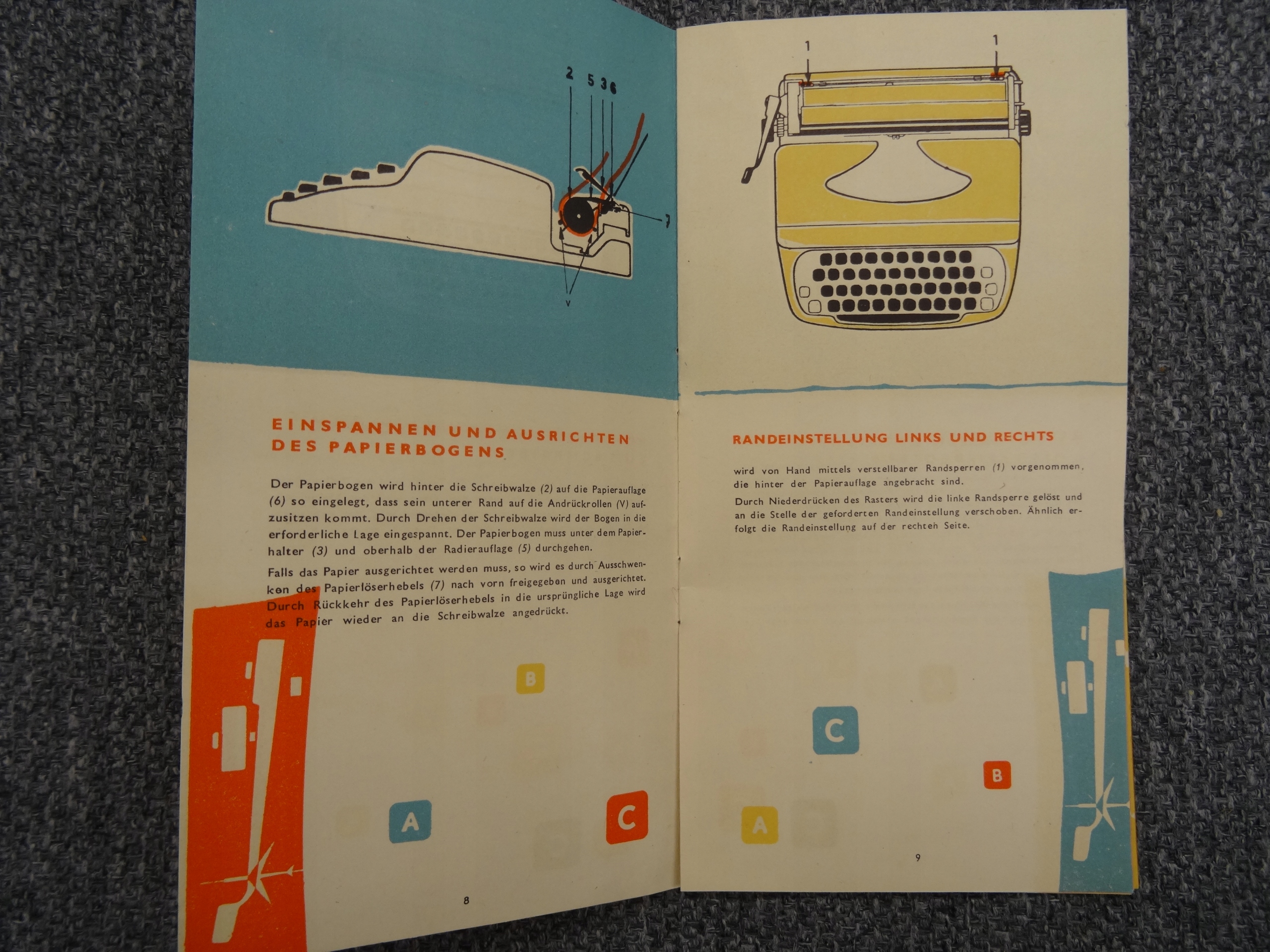 Удобная немецкая пишущая машинка-чемодан модели CONSUL. Машинка находится в элегантном чемоданчике на молнии. Машинка с оригинальной инструкцией и гарантией 1965 года, а также зубная щетка и щетка для чистки.