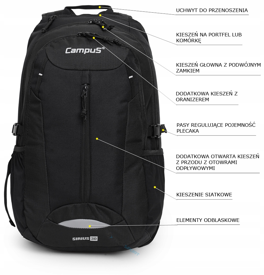 Высококачественный городской рюкзак. Модель «Sirius 30» идеально подходит для поездок, в школу или в качестве рюкзака для повседневного использования. Благодаря расширенной системе несущей нагрузки CDS, в сочетании с системой вентиляции с воздушным концом и анатомически формированными брекетами, рюкзак очень хорошо изношен, он удобен, и даже после долгого путешествия мы не будем чувствовать усталость. Он имеет одну главную камеру с большим погрузочным отверстием с плоским карманом для зуммера, дополнительная небольшая камера для меньшего оборудования с организатором и вместительным передним карманом. Сплошно сделано, хорошо продуман и закончен - усовершенствовал каждую деталь. Изготовлен из высококачественных материалов, таких как: полиэфирная остановка и 600D полиэфира. Этот материал характеризуется очень высокой устойчивостью к ссадивам и слезам. Рюкзак имеет ручку для переноски в руке, регулируемые скобки с заполнением воздушной сетки и отражающими элементами, которые повышают безопасность. Рюкзак был адаптирован для монтажа Buchek - у него есть внутренняя камера из пряжки с трубкой на открытом воздухе и ручки на листе труба. Хип -ремень стабилизирует рюкзак на плечах.