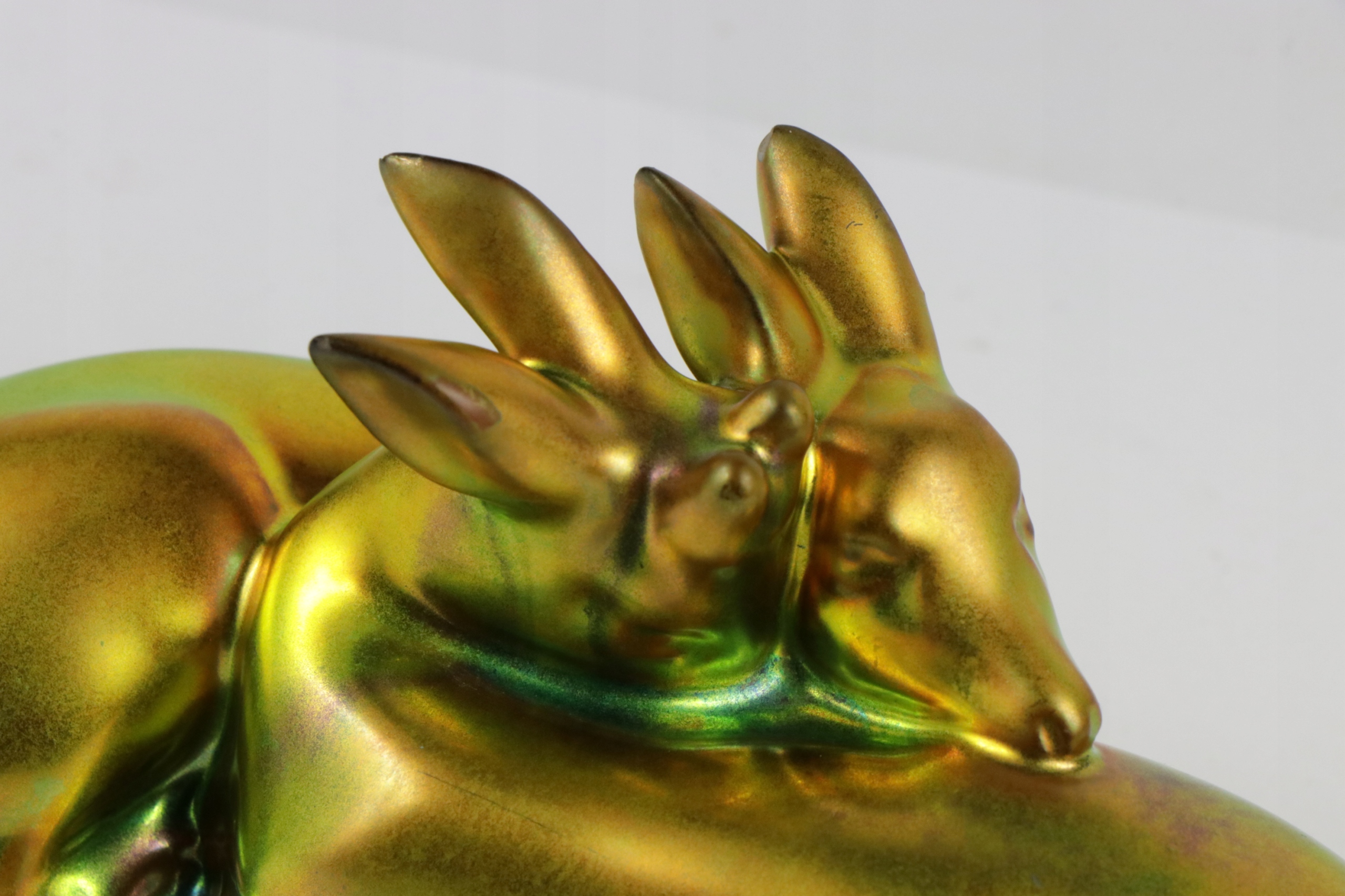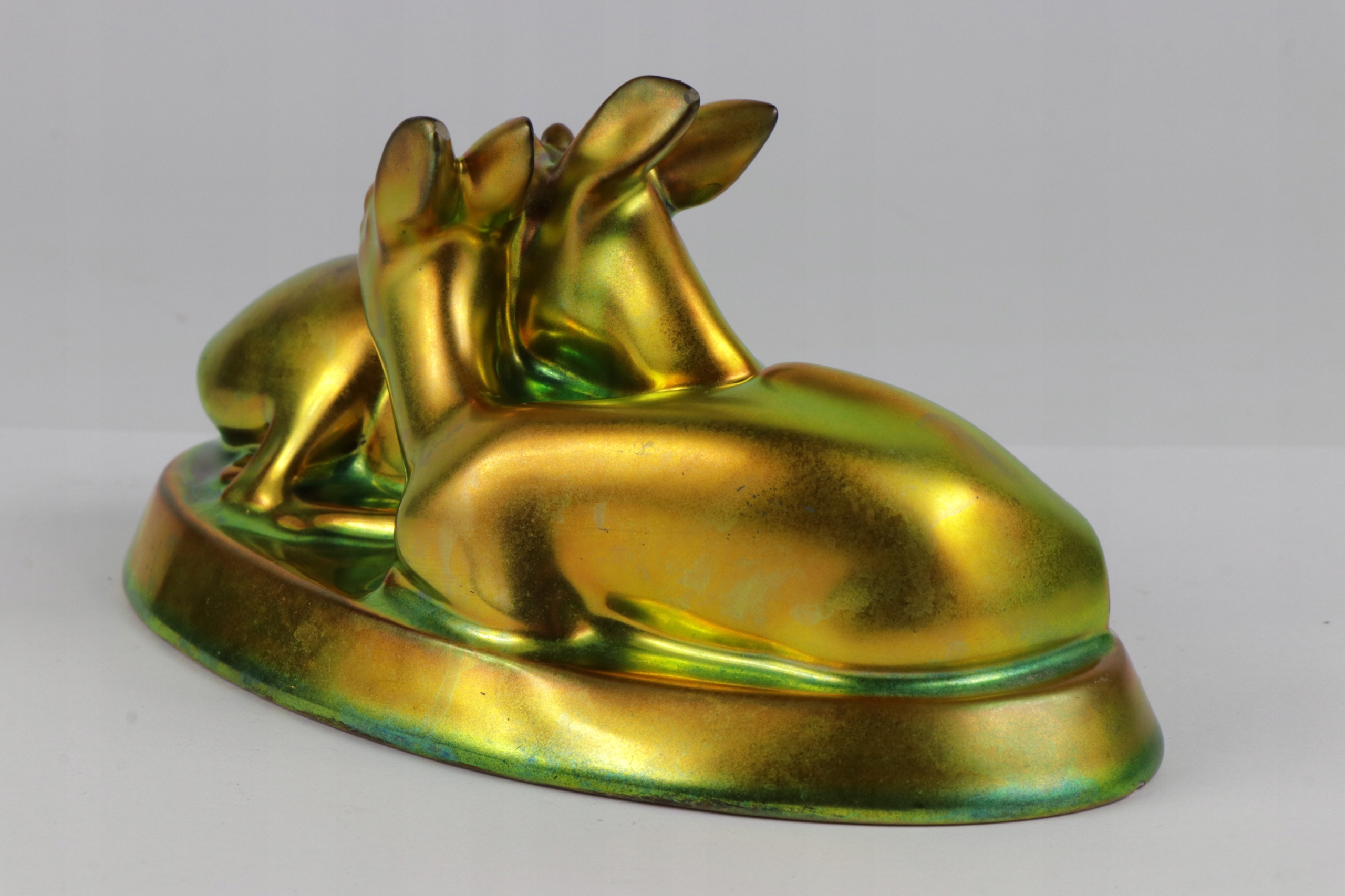 Статуэтка коллекционера арт -модерн с двумя Джелонками, подписанной с знаком zsolnay pecs. Фигура, покрытая характерным металлическим раздражающим остеклением.