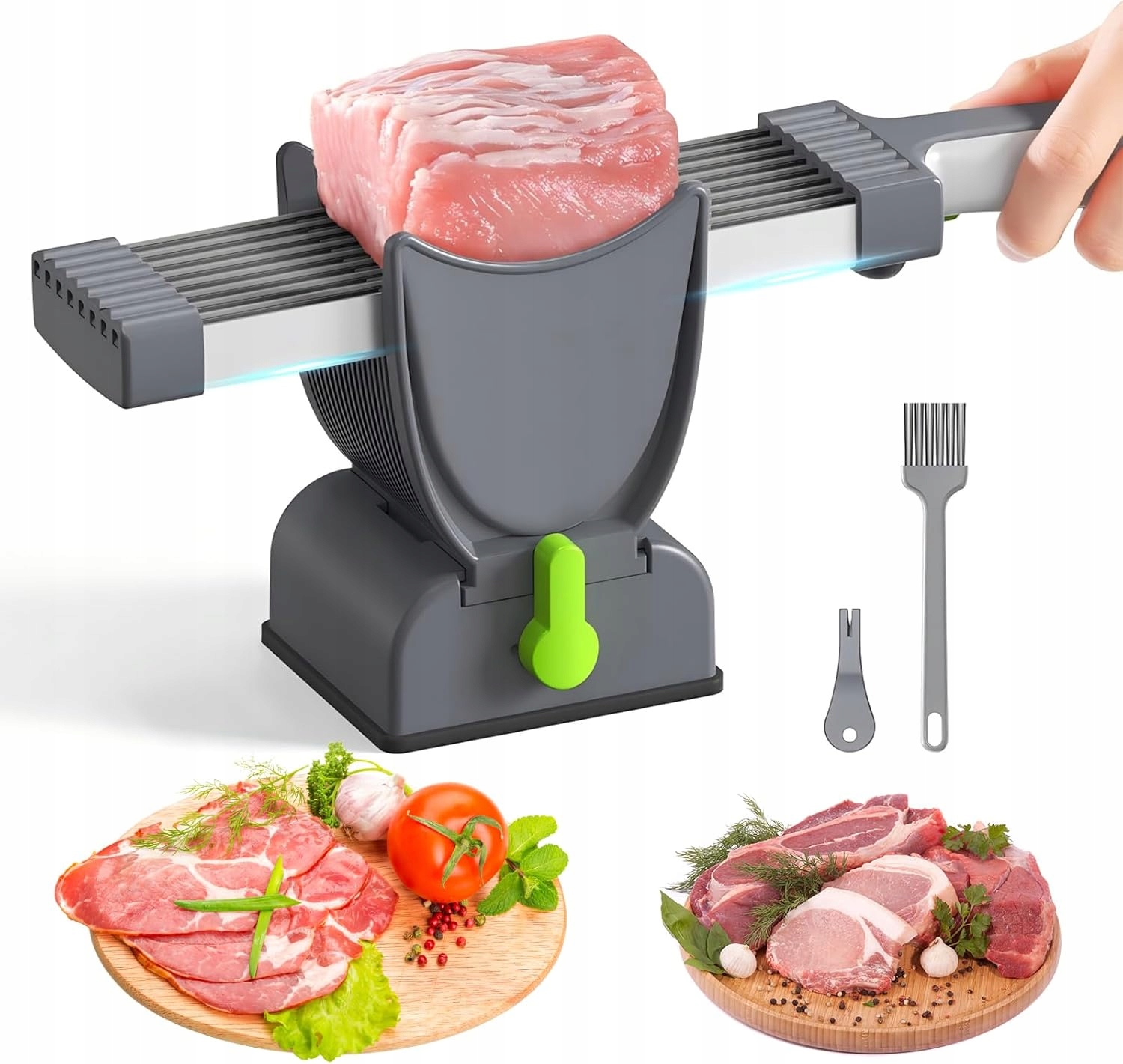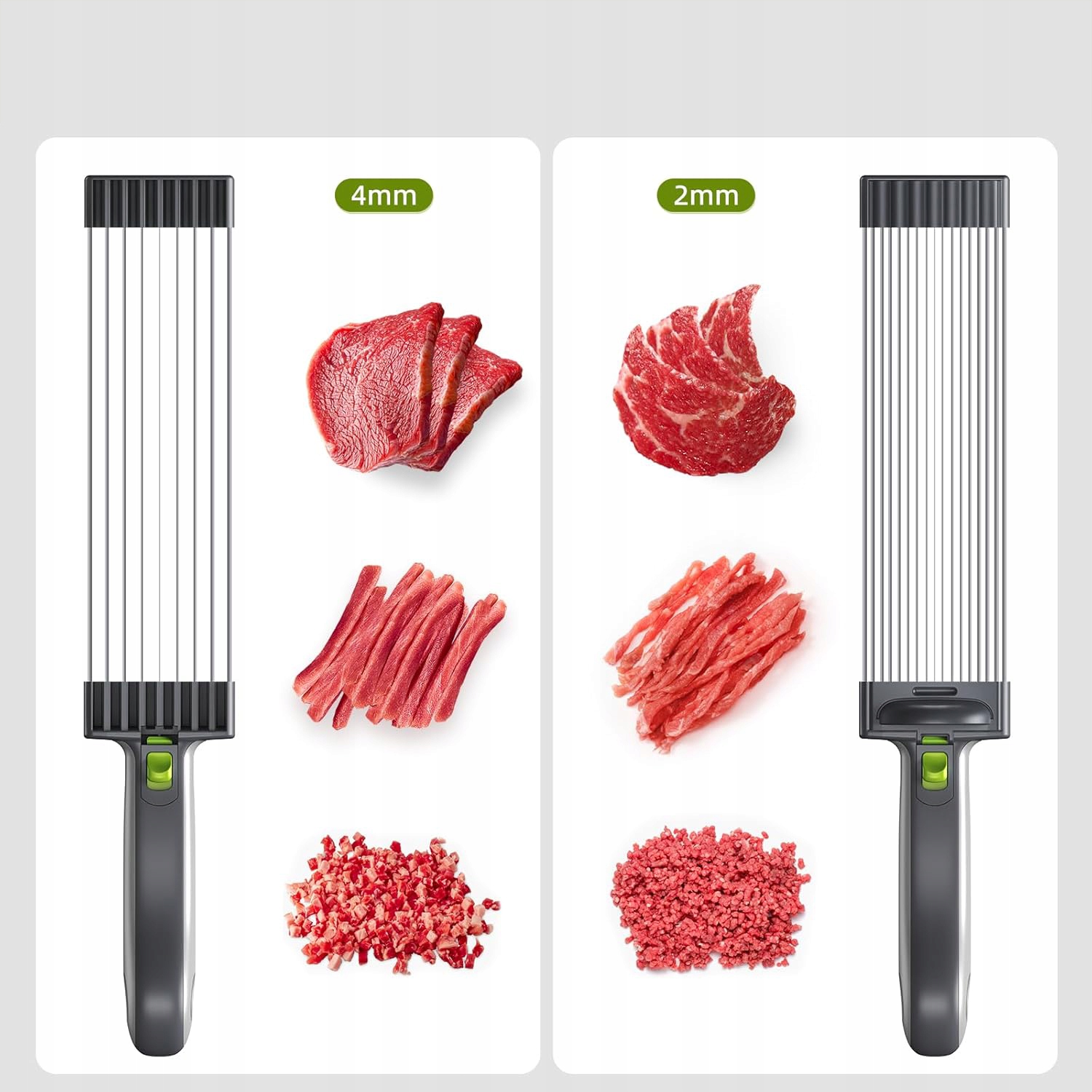 🥩🥩 Высокая производительность - один срез на 18 ломтиках: вы можете установить до 17 лезвий, чтобы вы могли сократить его до 17, длится свежий мясо для 18 тонких ломтиков. Соответствуя направлению мяса, их также можно разрезать на различные формы, например, В измельченном мясе, кубиках мяса и мясо.